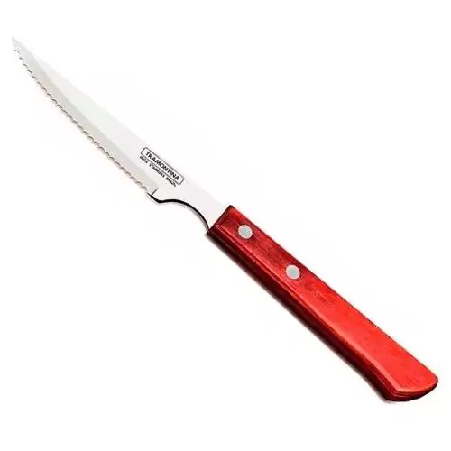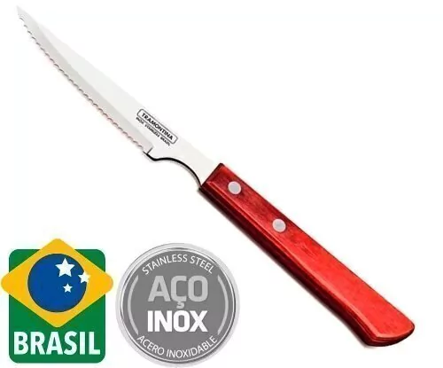 1 Cubierto Tramontina Polywood | Cuchillos Para Asado Muesca Peso 0,05 kg Longitud 229 mm Ancho 21 mm Altura 12 mm -Mango: Madera Laqueada -Color: Cerezo -Apto para lavavajilla La cena informal no determina la calidad de los cubiertos, utensilios y cuchillos. Por lo tanto, la línea Polywood tiene cuchillas de acero inoxidable en forma y grosor para asegurar la resistencia y evitar la deformación. El tratamiento térmico proporciona más durabilidad para el alambre tratado del mango polywood de madera fija con remaches de aluminio; es cómodo de manejar. Con garantía de cinco años, siendo hermosa, incluso con el uso pesado y sometido a impactos y altas temperaturas. Ellos pueden ir al lavavajillas.