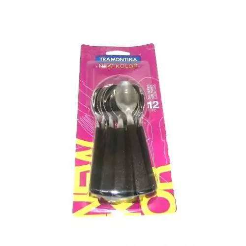 12 Cucharitas Tramontina New Kolor Mango Pvc Plastico Acero Blister contiene 12 unidades Longitud 135 mm Ancho 25 mm Altura 15 mm -Acero Inoxidable -Mango de Polipropileno Lleve a la mesa la alegría de los colores. Los cubiertos de la línea New Kolor tienen mangos de polipropileno de colores y resistentes. Con láminas de acero inoxidable los tenedores tienen alta resistencia y durabilidad. Todas las piezas pueden llevarse al lavavajillas.