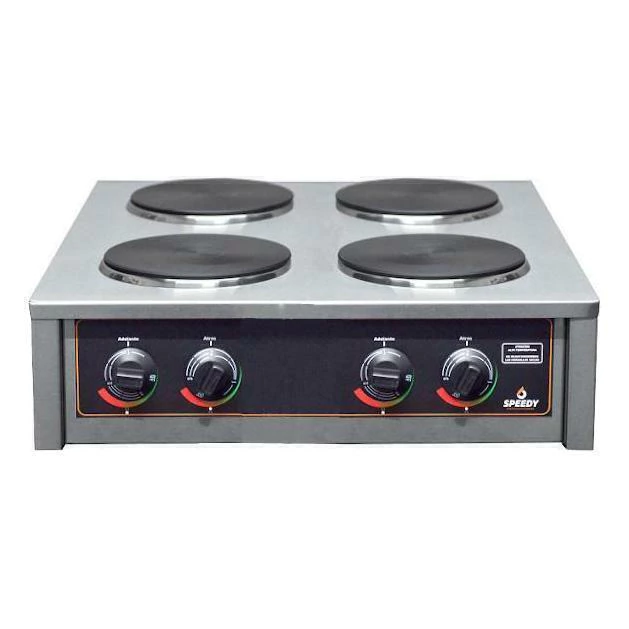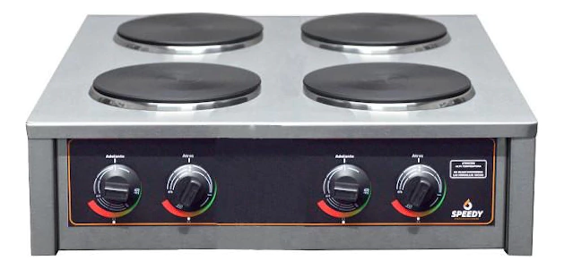 Anafe 4 Hornallas Electrico Speedy 2.6kw 220V Acero Cocina El Anafes Speedy Profesional con 4 hornallas redondas es un equipo diseñado para ofrecer una cocción eficiente y práctica en cocinas comerciales. Sus cuatro hornallas redondas permiten cocinar varios platos al mismo tiempo, facilitando la preparación en restaurantes, cafeterías y otros establecimientos gastronómicos. Beneficios del Producto: - Es una opción confiable y robusta, pensada para soportar el uso intensivo y brindar un rendimiento constante en entornos profesionales. - Además, su diseño compacto y funcional ayuda a optimizar el espacio en la cocina. Caracteristicas: Modelo 2304 Marca Speedy Color Gris Hornallas 4 Para cacerolas de 20 lts máximo, por hornalla. Control individual de temperatura. Hornallas de acero reforzado de 7 mm. Potencia total: 10,4 kw/h. Voltaje 220v.