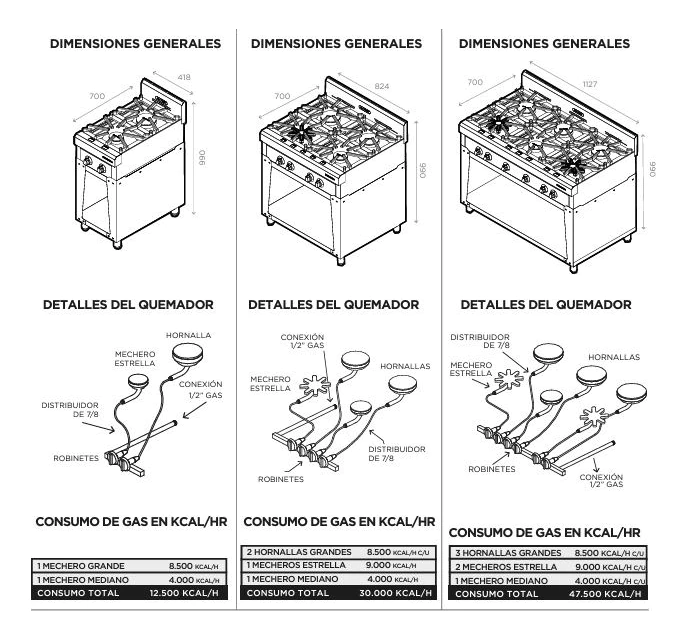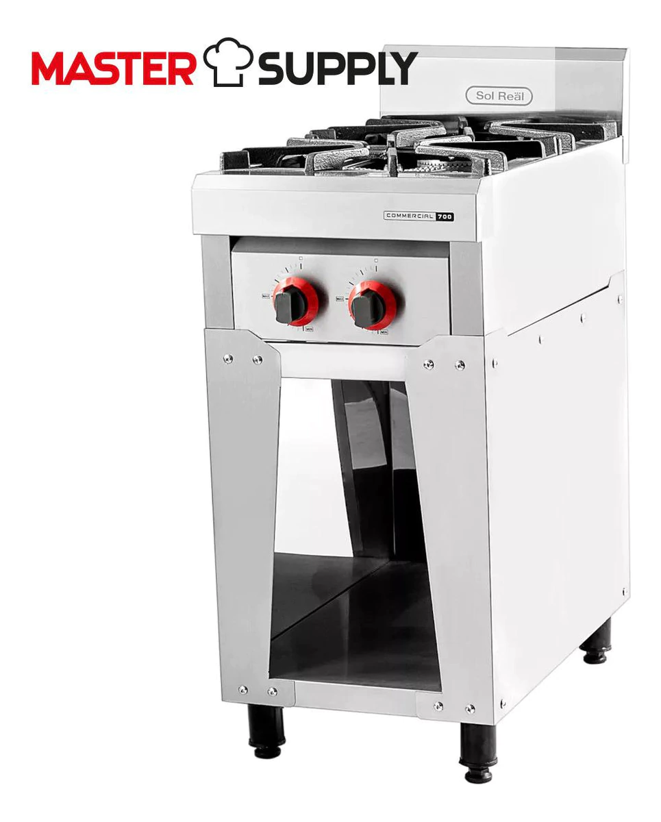 Anafe Industrial 2 Hornallas Sol Real Linea 700 Gas Envasado La línea 700 de Sol Real es una línea para trabajo intensivo en una cocina gastronómica, SOL Real es conocida por producir productos gastronómicos con un diseño y calidad fuera de serie. Características: Anafe 2 Hornallas - Línea Modular 700 Gabinete, base y laterales 100 % acero inoxidable esmerilado. Bandeja antiderrame desmontable. Rejas de fundición enlozadas. Respaldo desmontable. Patas regulables. Tipo de Gas, Envasado 1 mechero estrella grande (9.000 kcal /h). 1 mechero tradicional (3.500 kcal/h) Consumo Total 12.500 Kilocalorías/h Gabinete, base y laterales 100 % acero inoxidable esmerilado. - Dimensiones: Ancho 41,80 cm Alto 99 cm Profundidad 70 cm - Peso: 40 kg aprox.
