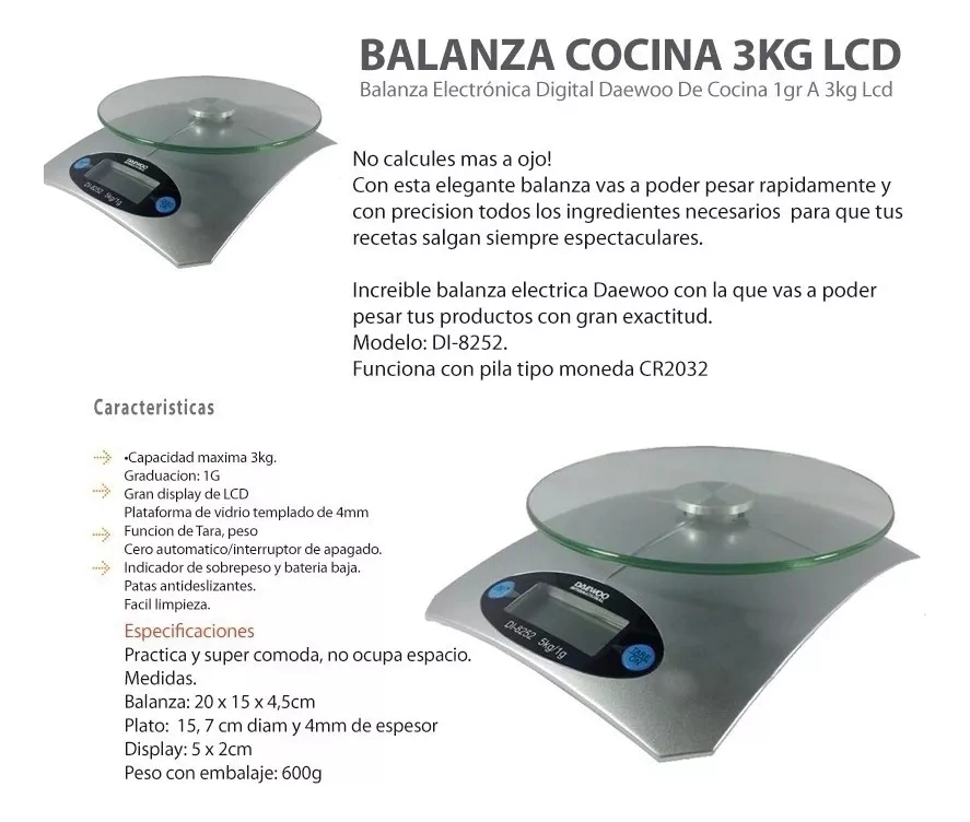 BALANZA DIGITAL DE COCINA DIGITAL VIDRIO ALPACA Eficiente y práctica Esta balanza cuenta con apagado automático, el cual cuando no detecte movimiento se va a apagar y reservar energía para su próximo uso. - Confiable Las balanzas están diseñadas para ser confiables a la hora de su uso, y arrojar los resultados más precisos posibles. - Practicidad en tu cocina Gracias a la función Tara, la balanza calculará el peso del recipiente que utilizarás, y luego volverá a 0 para que comiences a pesar los ingredientes. Cada vez que necesites incorporar uno nuevo, no será necesario cambiar de contenedor ya que esta opción reanudará la cuenta en cada paso de tu receta. CARACTERÍSTICAS: Capacidad 3kg Graduación 1gr Gran display de DLC Marca Alpaca Línea Cuidado Personal Modelo BALDAE8252 Motivo de GTIN 7798347810552 Plato 15,7cm diámetro y 4mm espesor