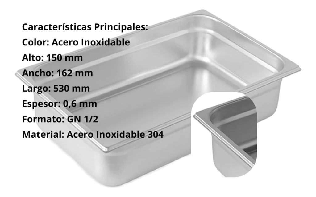 Fuente profunda GN 1/2 Largo 530x162x150mm Los GN Acero o Gastronorm son productos que no pueden faltar en su negocio, desarrollados especialmente para el almacenamiento de productos fríos y calientes, frutas, verduras, carnes, pescados o cualquier tipo de alimentos. Presentes en hotelería, catering y todo tipo de restaurantes. Con uso versátil en hornos convectores, convencionales y en general cualquier tipo de cocción. Características Principales: Color: Acero Inoxidable Alto: 150 mm Ancho: 162 mm Largo: 530 mm Espesor: 0,6 mm Marca: MASTER Materialidad: Acero Inoxidable 304 El acero inoxidable es unos de los materiales más higiénicos que existen. Su composición permite que la suciedad y agentes externos como el polvo y las bacterias no queden adheridos a la superficie. Es por ello que también es el material más utilizado en quirófanos y cocinas industriales. Sus mayores ventajas: - Máxima higiene y menor adherencia de la suciedad y agentes externos. - Fácil limpieza y gran durabilidad. - Resistente al calor y excelente conductor del mismo. - Material reciclable.