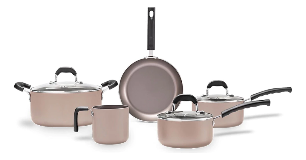 BATERIA DE COCINA SAFFRON EN ALUMINIO BRINOX 5PZS CHAMPAGNE Los set de ollas y sartenes de la línea Saffron son el complemento ideal para la preparación de todos tipo de platos en tu cocina, sus 2,5mm de espesor y sus 5 capas de anti adherencia permiten una fácil manipulación de los alimentos y una simple limpieza. Viene de color champagne, color que le dará vida a tu cocina. Beneficios del Producto: Es un producto de calidad que resiste altas temperaturas, contiene teflón clase A libre de PFOA. Estructura de aluminio, cocina de manera uniforme y más rápida - Libre de PFOA - Menos Aceite - No se pega y es más fácil de limpiar. **Composición** SAFFRON 5 Piezas: Cacerola con Tapa 24x11,5 cm - 4,7 L . Olla con Tapa 18x9 cm - 2,05 L . Olla con Tapa 16x8 cm - 1,45 L . Sartén 24 x 5 cm -1,6 L . Hervidor 12x12 cm - 1,2 L. CARACTERÍSTICAS COLOR CHAMPAGNE MARCA Brinox LINEA SAFFRON TECNOLOGÍA PRO-FLON (Antiadherente) LIBRE DE PFOA SI PRODUCTO Batería de Cocina MATERIAL Aluminio MANIJAS Baquelita DIMENSIONES DEL PACKAGING Alto 14.5 cm. Ancho 70 cm. Profundidad 43.5 cm. Peso 5.447 kg.