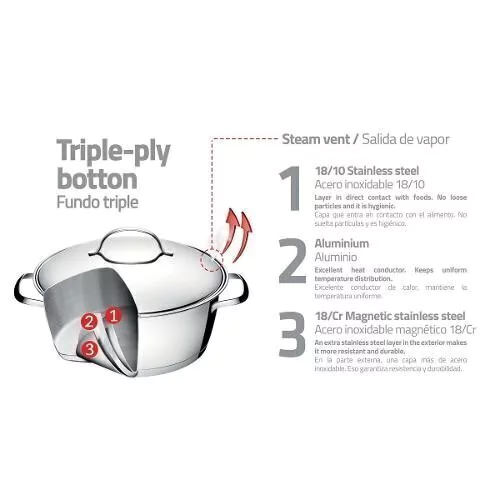Cacerola Alta Allegra 24cm Asas Acero Triple Fondo Tramontina Peso 1,42 kg Longitud 317 mm Ancho 263 mm Altura 202 mm Diámetro 24.0 cm Capacidad 5.70 L - El diseño simple de la línea Allegra se creó para facilitar las tareas en el horno y cocina. - Hecha totalmente de acero inoxidable, no suelta ningún residuo en los alimentos, manteniéndolos sanos. - Altamente durable, mantiene las características originales, conservando la belleza, higiene y durabilidad del material. - El fondo triple (acero inoxidable + aluminio + acero inoxidable) distribuye el calor uniformemente, proporcionando una cocción más rápida y uniforme, ahorrando energía y manteniendo los alimentos calientes durante un tiempo mayor. - Se puede llevar al horno para gratinar o finalizar platos, a una temperatura máxima de 260°C. - Tiene un diseño diferenciado y moderno,con terminación en alto brillo. - Su diseño limpio y sin ángulos facilita la limpieza. - Tapa con salida de vapor y encaje perfecto. - Se puede lavar diariamente en lavavajillas. - Se puede utilizar en cocinas: a gas, eléctricas, sobre vidriado cerâmico y de inducción.
