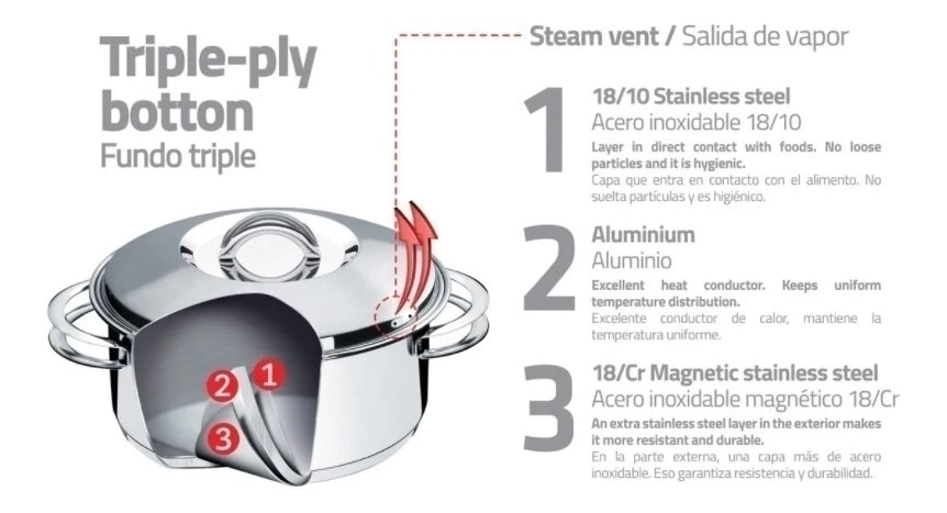 Prepare recetas llenas de sabor con la cacerola Tramontina honda de acero inoxidable fondo triple con tapa y asas 28 cm de diámetro 8,4 L de la línea Solar. Con una buena olla usted puede hacer numerosas recetas y explorar su lado gastronómico, sea para realizar recetas que ya existen o para crear una nueva. Hecha de acero inoxidable con fondo triple (acero inoxidable + aluminio + acero inoxidable), será posible que el calor sea distribuido de forma uniforme, garantizando una cocción rápida, además de mantener los alimentos calientes por más tiempo. Extremadamente funcional, puede ser utilizada tanto en la cocina como en el horno para finalizar platos. Y no se preocupe, sabemos que cocinar puede ser agotador, por esta razón, puede lavarse diariamente en lavavajillas. Con su diseño limpio y sin esquinas la limpieza es mucho más fácil. Ahora no hay más excusas para preparar esa receta que tanto le gusta. Principales funciones y beneficios Comida más sana: por ser de acero inoxidable, la cacerola Tramontina no libera ningún tipo de residuo en sus recetas. Fácil de usar: una cacerola práctica para todas sus recetas y que se luce en cualquier tipo de cocina: a gas, eléctrica, vitrocerámica y de inducción. Además, tiene tapa con salida de vapor y encaje perfecto. Más durable: el acero inoxidable Tramontina es una materia prima noble, resistente y que se luce por mucho más tiempo en la cocina. Ahorrar tiempo y energía: el secreto está en el fondo triple (acero inoxidable + aluminio + acero inoxidable), que distribuye el calor uniformemente, proporcionando una cocción más rápida. Por eso, puede mantenerse el fuego bajo durante toda la preparación y así ahorrar energía. Además, la cacerola totalmente fabricada en acero inoxidable puede ir al horno para gratinar o finalizar platos, a una temperatura máxima de 260º C. Fácil de limpiar: dejar su cacerola brillante es simple, sólo se necesita agua, jabón y una esponja blanda. Si prefiere, puede lavarla en el lavavajillas. Recomendaciones de uso La capacidad volumétrica máxima para cocinar es de 3/4 de la capacidad total de la pieza. Antes de su uso, retire cualquier etiqueta presente en el producto; recomendamos lavarlo inmediatamente. Use una fuente de calor suave, para evitar que el alimento se pegue al fondo de la cacerola. El fondo triple distribuye el calor uniformemente, sin necesidad de usar fuego alto. Además, eso genera ahorro de energía. Cuando se utilice la cacerola en cocinas a gas, la llama no debe exceder la base de la olla. Si se usa una chapa eléctrica, la chapa debe tener el mismo diámetro que la cacerola o diámetro menor. No caliente el alimento poniendo una cacerola u cualquier utensilio del mismo diámetro sobre o otro. Ese procedimiento es peligroso, porque crea vacío e imposibilita su retirada. No deje la cacerola vacía sobre una fuente de calor. Siempre disuelva la sal en agua hirviendo o con los alimentos, mezclando los ingredientes al inicio de la cocción. Algunos alimentos que tienen almidón, como las pastas y el arroz, pueden dejar manchas en la parte interna de la cacerola durante la cocción. Para retirar fácilmente las manchas, pase un paño humedecido en jugo de limón o vinagre, o use la pasta de pulir acero inoxidable Tramontina. Evite dejar alimentos en la cacerola durante mucho tiempo; la sal también puede provocar manchas. Para que la cacerola de acero inoxidable esté siempre linda y brillante, le recomendamos lavarla solamente con detergente y esponja. Además, en las partes opacas de la cacerola se puede utilizar el lado más abrasivo de la esponja con saponáceo líquido para remover las manchas más difíciles. Después del lavado, siempre que sea posible, enjuague la cacerola con agua caliente y séquela inmediatamente, para que mantenga el brillo original, porque el cloro y las sustancias contenidas en el agua pueden dejar manchas en la olla. Verificar las ollas y tapas cuyo sistema de fijación utiliza tornillos. Con el tiempo de uso, los tornillos pueden aflojarse. Por seguridad, se recomienda ajustarlos periódicamente. Se puede llevar al horno a una temperatura máxima de 260°C, pudiendo ocurrir cambios de coloración. Las asas, pomos y mangos se calientan durante la cocción. Aconsejamos el uso de guantes o paño durante su manipulación. Hay que tener cuidado al manejar el producto, principalmente con alimentos y líquidos calientes. Para su seguridad, use el producto solamente hasta su capacidad máxima indicada. Certificación Producto con certificación obligatoria de acuerdo a la OCP 0003, registro 001470/2018, modelo (línea) Solar, de acuerdo a la resolución INMETRO 419/2012. Peso 2,89 kg Capacidad 8.40 L