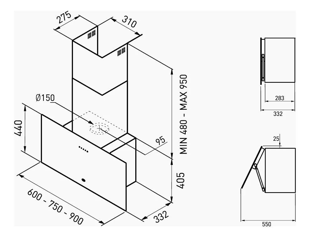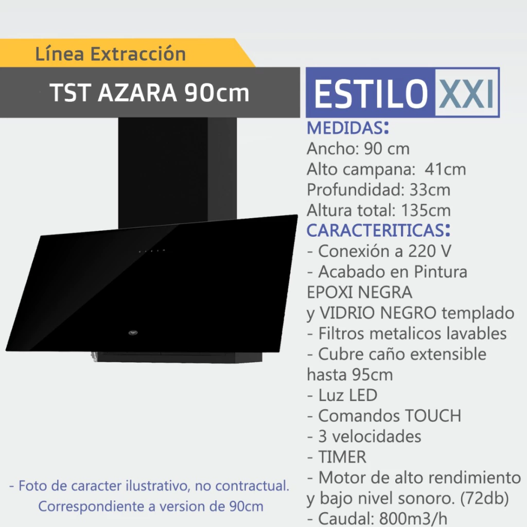 Campana Extractor Purificador Tst Azara Vidrio Negro 90cm Características: Motor interno: 6" de alto rendimiento y bajo nivel sonoro. Comando: touch con timer programable. Velocidades: 3 (V1-V2-V3). Nivel de ruido (dB)*: Iluminación: tecnología led. Potencia del motor: 182 W. Acabado: pintura epoxi negra, vidrio negro templado. Cubre caño: extensible. Filtro: metálico lavable. Extracción: 800 m3/h con salida libre. Ancho x Altura x Profundidad 90 cm x 40.5 cm x 33.2 cm Opcional: - NO INCLUIDO - Filtro carbono activado (sin salida al exterior)