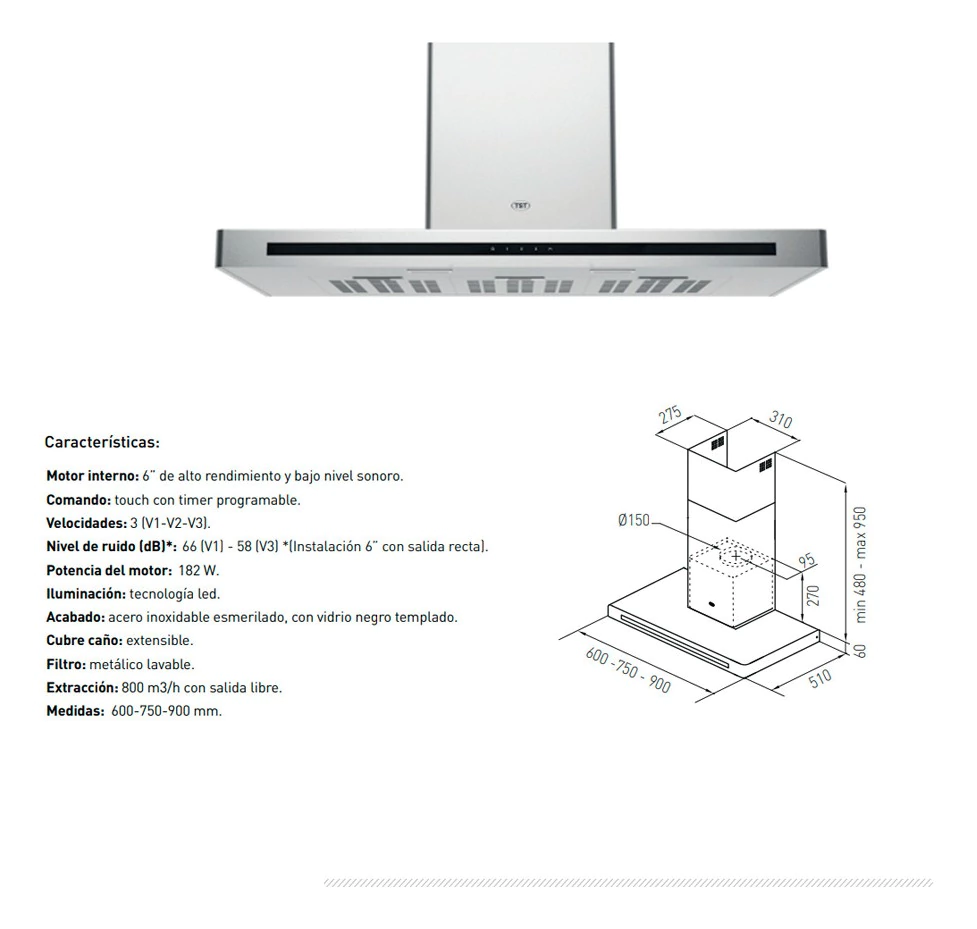 Extractor Purificador Cocina Tst Nihuil Pared 75cm 3v