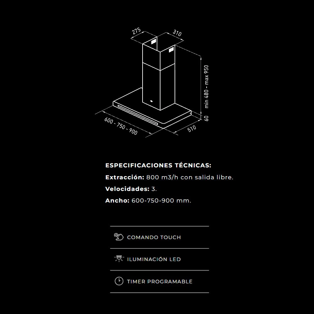 - Acabado: acero inoxidable esmerilado, con vidrio negro templado.