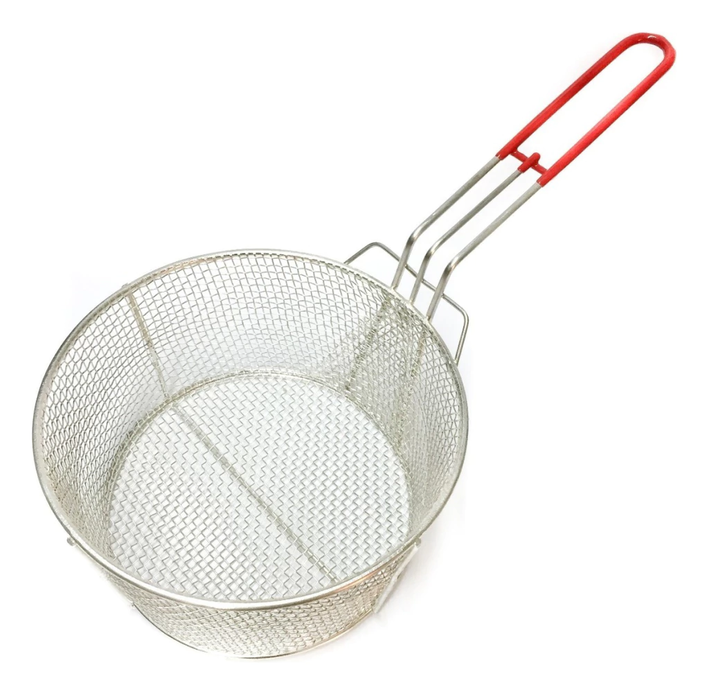 Canasto Freidor Redondo Alambre Estañado Mango Goma 24cm CARACTERÍSTICAS *Medidas: -Diámetro superior: 24 cm -Diámetro base: 21 cm -Alto: 12 cm -Largo total: 42 cm -Largo del mango: 24 cm *Material y terminación: Alambre de acero estañado *Reforzado de uso gastronómico y hogareño *Color: Rojo *Industria nacional. *No se oxida *Sirve para hervir o freir en cacerola, olla o freidora. *Se recomienda esta medida para cacerola Nº26 (esto está sujeto al modelo de la cacerola/olla)