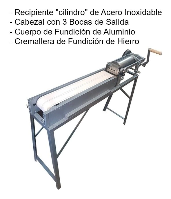 MAQUINA CHURRERA CON CINTA AREAN 4KG 3 BOCAS Detalles: - Recipiente cilindro de Acero Inoxidable - Cabezal con 3 Bocas de Salida - Cuerpo de Fundición de Aluminio - Cremallera de Fundición de Hierro - Accionamiento a manija manual de dos velocidades - Largo Cinta: 70cm - Ancho Cinta: 12cm - Caballete base de Hierro Soldado - Ancho Máquina: 45cm - Alto Máquina: 100cm - Largo Máquina: 140cm