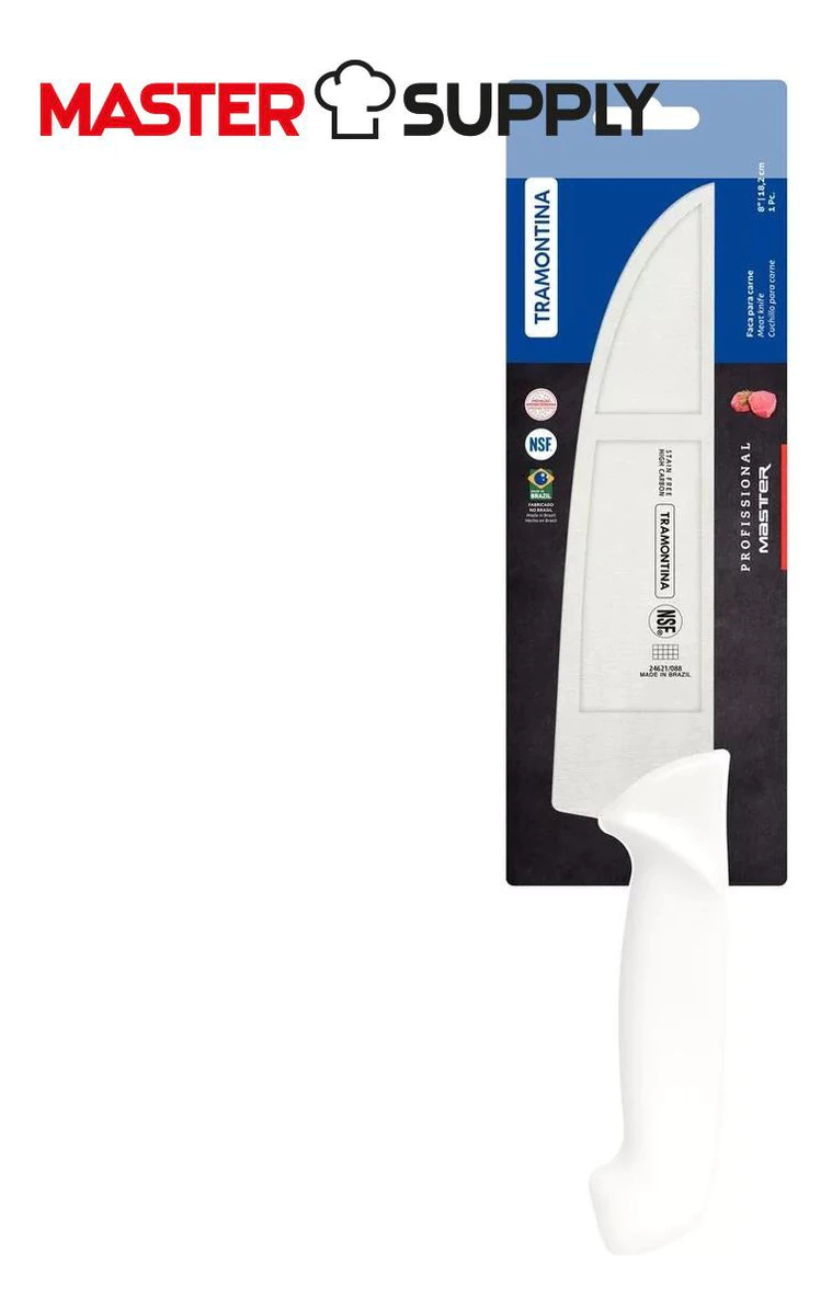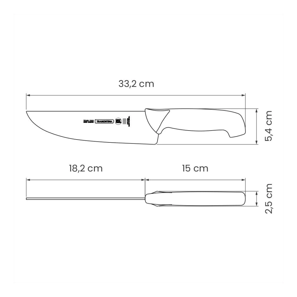 PROFESIONAL Cuchillo carni.8" o Material: Lámina de acero inoxidable/mango de polipropileno. o Modelo: 24621/188 o Marca: Tramontina o Pulgadas: 8'' o Peso: 0,14 kg o Medidas: 32,2 cm de largo x 5,4 cm de ancho x 2,5 cm de alto o Medida extra: 19,5 cm largo total de lamina CARACTERISTICAS: -Lámina resistente, afilada y duradera. -Lámina de acero inoxidable especial tratada con un proceso subcero, que asegura niveles promedio de dureza de 56 HRC. -Desbaste cónico en el espesor correcto para cada aplicación, garantizando la precisión y la durabilidad en el filo de corte. -Mango anatómico, higiénico y seguro. -Mango de polipropileno texturizado, que ofrece más comodidad y seguridad en el manejo. -El mango directamente inyectado sobre la espiga, que garantiza perfecta adhesión y evita la retención de residuos. -Mango con protección antimicrobiana que inhibe el crecimiento de hongos y bacterias, lo que ofrece beneficios en higiene y reduce los microorganismos causantes de la contaminación.