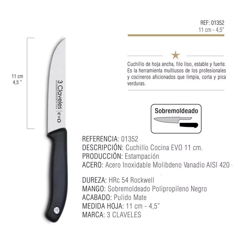 Cuchillo Cocina Oficio Evo 11cm Acero Inoxidable - Mango Polipropileno - Estampado Referencia 01352 Cuchillo de hoja ancha, filo liso, estable y fuerte. Es la herramienta multiusos de los profesionales y cocineros aficionados que limpia, corta y pica verduras. Material: Acero Inoxidable, Mango Polipropileno Producción: Estampado Tamaño hoja: 11 cm Color: Negro Acabado: Pulido Mate Presentación: Blister Uso: Cuchillos Cocinero Origen: España ¡Utilice siempre los cuchillos con cuidado! - Afilar los cuchillos regularmente Un cuchillo afilado es más seguro que uno sin filo ya que se hace menos fuerza al cortar y la mano no se cansa tan pronto. - Mantener los cuchillos bien visibles Mantenga siempre el cuchillo en un lugar visible, con el mango hacia usted y alejado del borde de la mesa para evitar su caída. No lo cubra con ningún objeto para evitar tocar la hoja accidentalmente. Si ofrece el cuchillo a otra persona, hágalo siempre por el mango. - Utilice el cuchillo apropiado para cada finalidad El pescado, la carne, las verduras o el pan son diferentes en consistencia y tamaño. Por ello, existe un cuchillo apropiado para cada uso. - Nunca intente atrapar al vuelo un cuchillo mientras cae Esto implica un alto riesgo de cortarse seriamente. - Lavar por separado los cuchillos Lo más apropiado es lavarlos inmediatamente después de su uso y secarlos con un paño. No los coloque en la bacha sin más para evitar riesgos de corte, y séquelos desde el mango hacia la punta, y desde el lomo hacia el filo. [