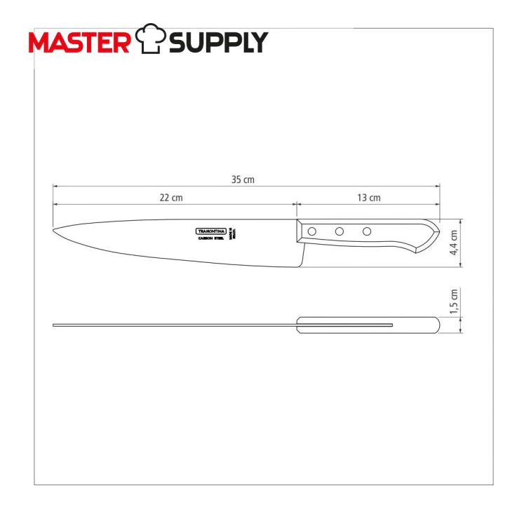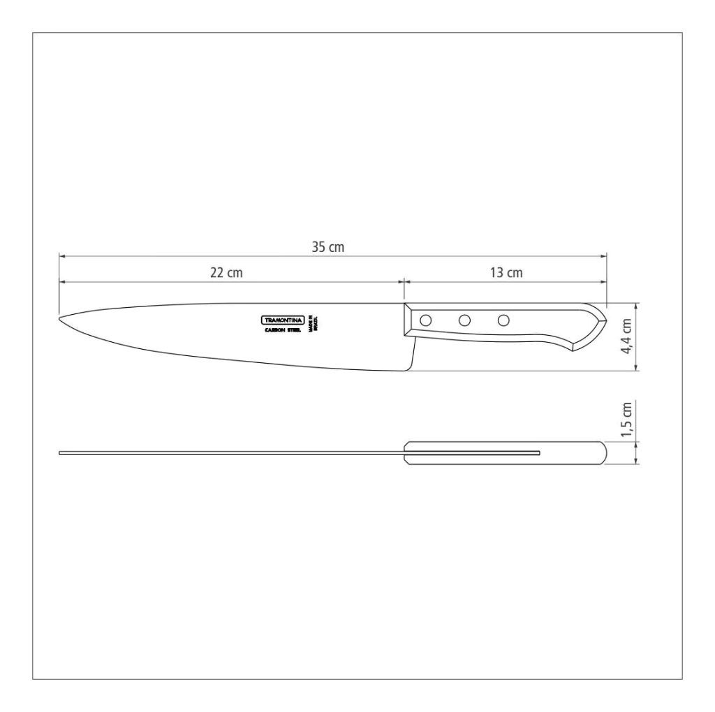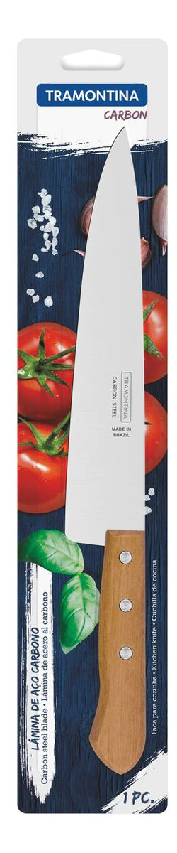Cuchillo Cocina Carbón Tramontina Mango Madera 22cm Los cuchillos de las línea Carbono tiene lugar asegurado en su cocina. El toque de la naturaleza lo dan los mangos rústicos de madera, todos con terminación de remaches de aluminio. El poder de corte lo garantiza el tratamiento térmico aplicado a las láminas de acero al carbono con terminación de barniz protector. Longitud: 35 cm Ancho: 4,4 cm Altura: 1,5 cm Principales funciones y beneficios Lámina de acero carbono. Mango madera. Remaches de aluminio. Recomendaciones de uso USO SEGURO Y ADECUADO: Producto cortante y perforante: tenga cuidado en su manejo y manténgalo fuera del alcance de los niños. Los cuchillos con lámina de acero carbono se caracterizan por una mayor resistencia en el filo, lo cual le confiere buen poder de corte y son fáciles de afilar. Esa propiedad del acero carbono otorga mayor propensión a la oxidación y decoloración del acero, si no se toman los debidos recaudos: Su cuchillo es una herramienta de corte, no la utilice para otros fines inadecuados. Procure mantenerlo siempre afiliado. Evite procedimientos que puedan dañar el filo. Se recomienda que las operaciones de corte se realicen sobre una plancha de madera, de esta forma protegerá la superficie de trabajo de su cocina y retardará el desgaste del filo de su cuchillo. Lávelo con agua tibia después de utilizarlo y séquelo inmediatamente, así evitará que el cuchillo seque en forma natural, recuerde que la humedad es la mayor enemiga de su cuchillo de acero carbono. Al guardar el cuchillo carbono protéjalo con algún aceite, pues de esta forma reducirá las posibilidades de oxidación. El aceite comestible es una buena opción.