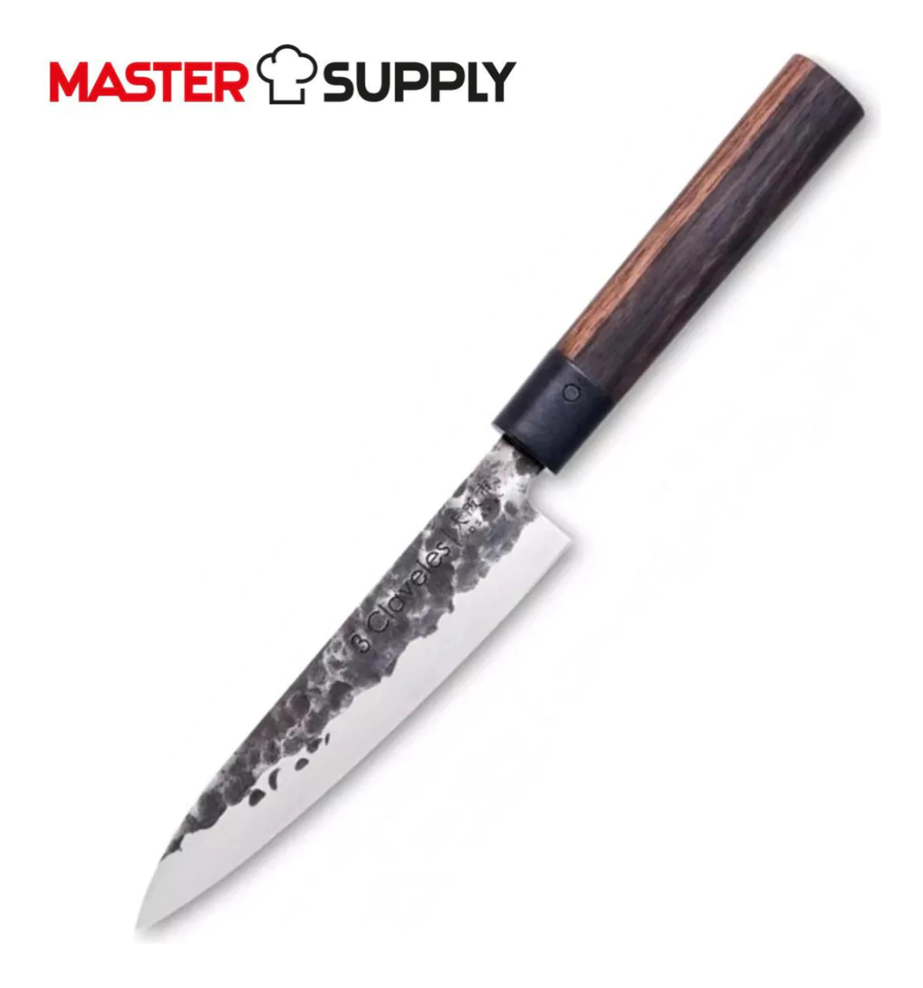 Cuchillo Forjado Cocina 3 Claveles Osaka 16cm Cuchillo de Verduras Osaka. CARACTERÍSTICAS: - Cuchillo pequeño de hoja fuerte, filo liso y punta estable. Limpia, pela y corta pequeñas frutas y verduras. - Mango en Madera de Granadillo y acabado encerado. - Hojas únicas forjadas a mano. -Material Acero Inoxidable -Materiales Mango Madera Granadillo -Producción Forjado -Modelos Osaka -Tipo Cuchillos Cocinero ¡Utilice siempre los cuchillos con cuidado! - Afilar los cuchillos regularmente Un cuchillo afilado es más seguro que uno sin filo ya que se hace menos fuerza al cortar y la mano no se cansa tan pronto. - Mantener los cuchillos bien visibles Mantenga siempre el cuchillo en un lugar visible, con el mango hacia usted y alejado del borde de la mesa para evitar su caída. No lo cubra con ningún objeto para evitar tocar la hoja accidentalmente. Si ofrece el cuchillo a otra persona, hágalo siempre por el mango. - Utilice el cuchillo apropiado para cada finalidad El pescado, la carne, las verduras o el pan son diferentes en consistencia y tamaño. Por ello, existe un cuchillo apropiado para cada uso. - Nunca intente atrapar al vuelo un cuchillo mientras cae Esto implica un alto riesgo de cortarse seriamente. - Lavar por separado los cuchillos Lo más apropiado es lavarlos inmediatamente después de su uso y secarlos con un paño. No los coloque en el fregadero sin más para evitar riesgos de corte, y séquelos desde el mango hacia la punta, y desde el lomo hacia el filo.