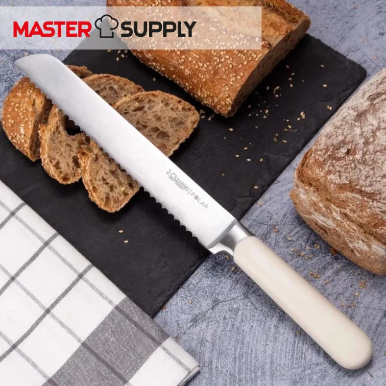 Cuchillo Forjado Panero Polar 3 Claveles 20cm CARACTERÍSTICAS: El cuchillo de pan Polar, de hoja larga y filo ondulado, corta sin esfuerzo la corteza dura del pan consiguiendo rebanadas limpias. - La colección Polar son cuchillos forjados con un práctico mango de color blanco. - Hoja de acero inoxidable de 20 cm. - Mango en ABS. - Apto para el lavavajillas. -Producción Forjado -Modelos Polar -Tipo Cuchillos Pan ¡Utilice siempre los cuchillos con cuidado! - Afilar los cuchillos regularmente Un cuchillo afilado es más seguro que uno sin filo ya que se hace menos fuerza al cortar y la mano no se cansa tan pronto. - Mantener los cuchillos bien visibles Mantenga siempre el cuchillo en un lugar visible, con el mango hacia usted y alejado del borde de la mesa para evitar su caída. No lo cubra con ningún objeto para evitar tocar la hoja accidentalmente. Si ofrece el cuchillo a otra persona, hágalo siempre por el mango. - Utilice el cuchillo apropiado para cada finalidad El pescado, la carne, las verduras o el pan son diferentes en consistencia y tamaño. Por ello, existe un cuchillo apropiado para cada uso. - Nunca intente atrapar al vuelo un cuchillo mientras cae Esto implica un alto riesgo de cortarse seriamente. - Lavar por separado los cuchillos Lo más apropiado es lavarlos inmediatamente después de su uso y secarlos con un paño. No los coloque en el fregadero sin más para evitar riesgos de corte, y séquelos desde el mango hacia la punta, y desde el lomo hacia el filo.