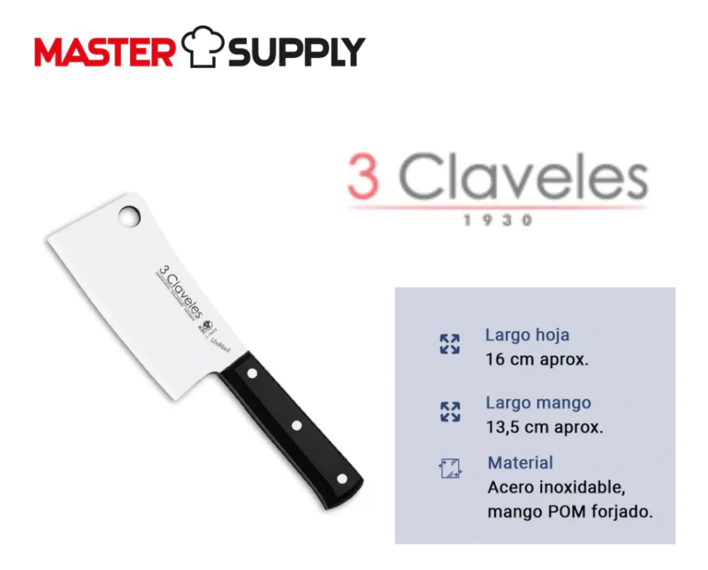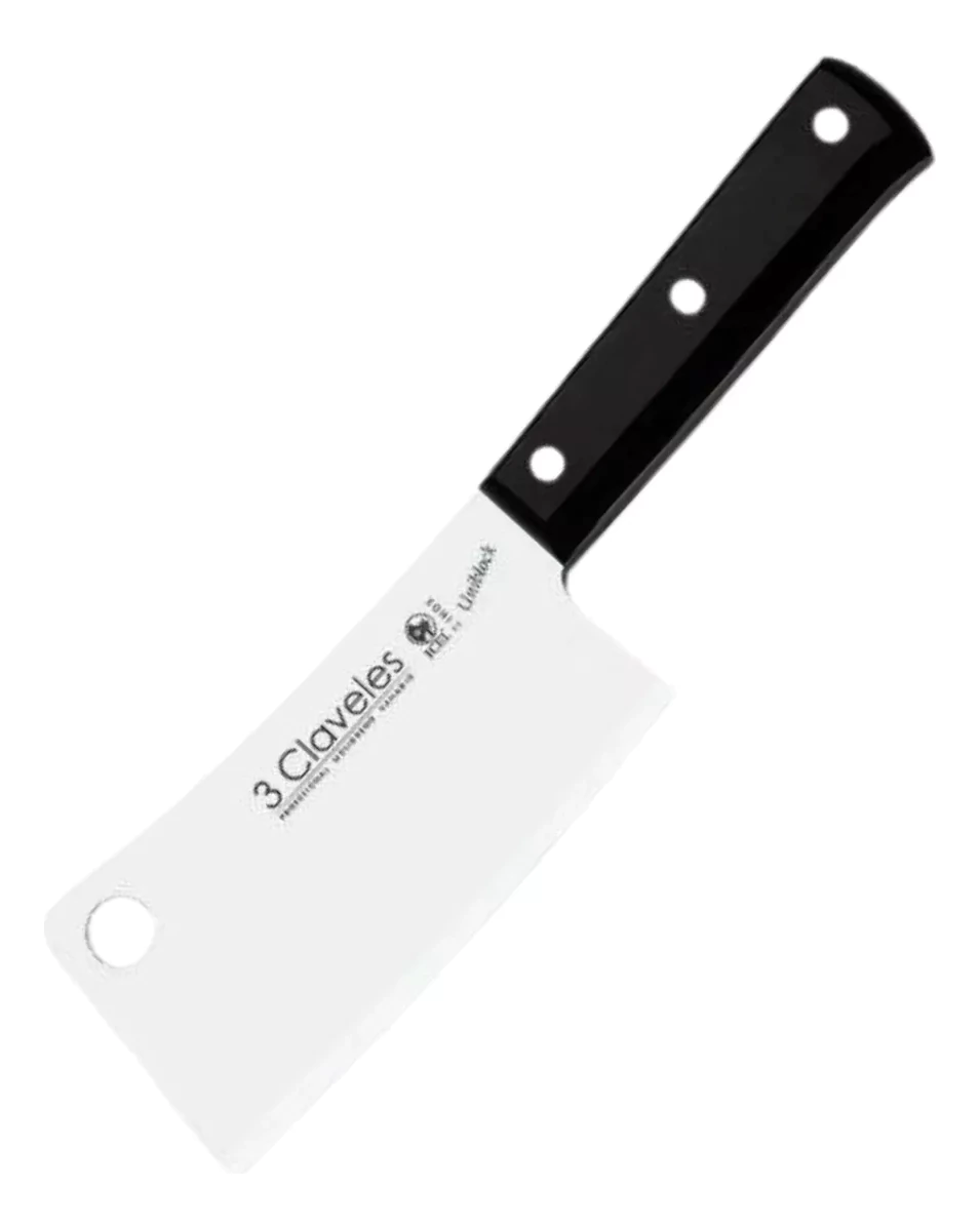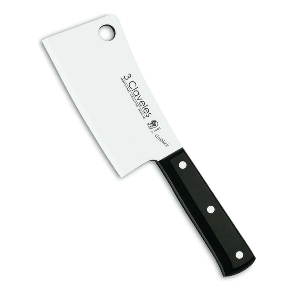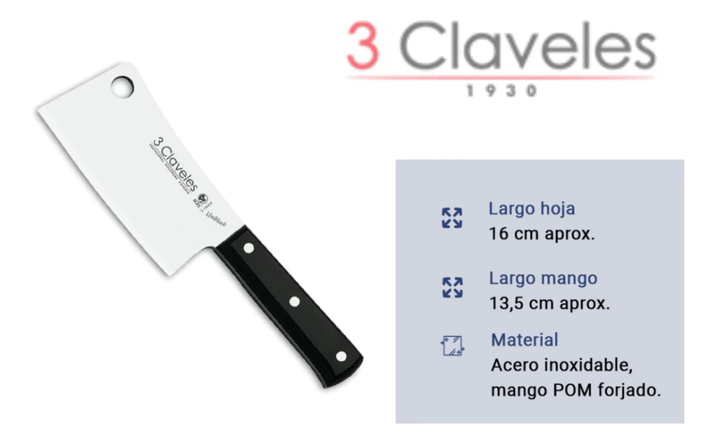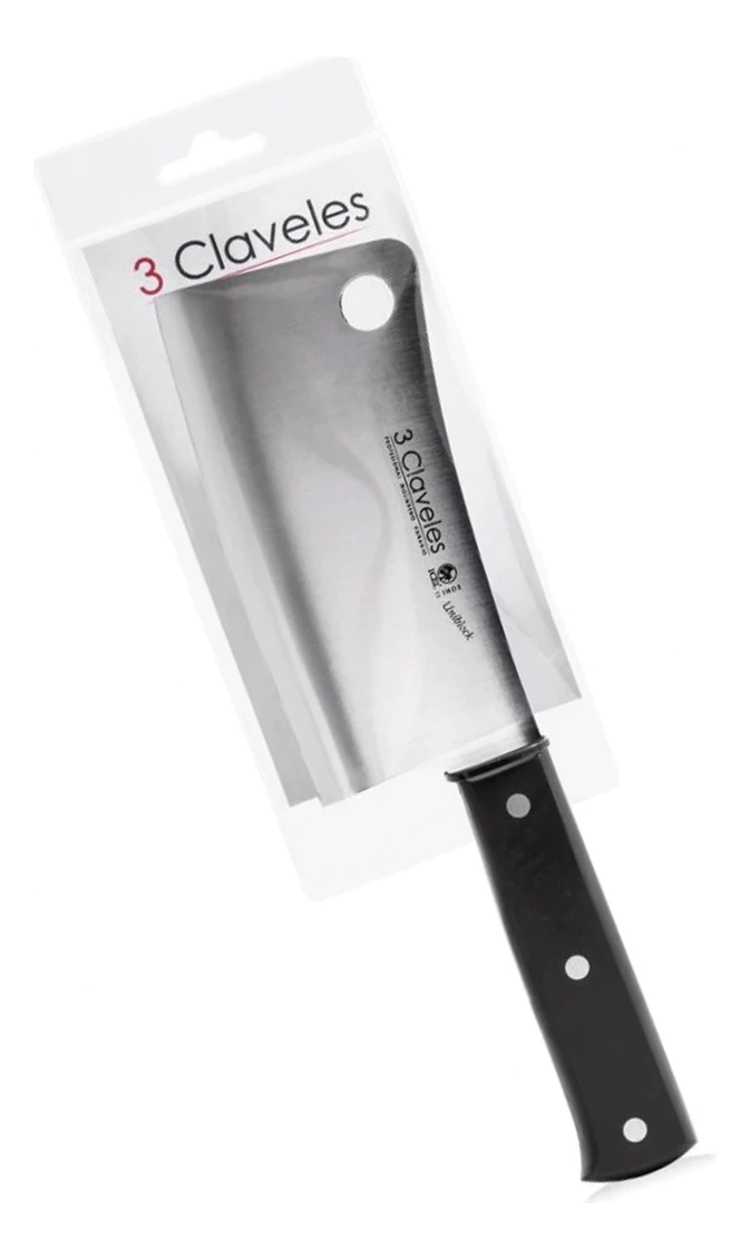 Cuchillo Rectangular 16cm Acero Inox. 3 Claveles Uniblock Los cuchillos 3 Claveles tienen una alta capacidad de corte y un filo duradero. Para elegir un cuchillo de cocina hay que tener en cuenta diferentes factores, como el uso, la ergonomía o el material del cuchillo. Los cuchillos profesionales 3 Claveles están fabricados en acero inoxidable de alta calidad, correctamente ensamblados para evitar la proliferación de bacterias y son ergonómicos para un mayor confort y seguridad del usuario. Características: Linea UNIBLOCK Modelo 1191 Peso: 615 grs Peso embalado: 634 grs Acabado: Pulido semi mate Material de la hoja: Acero inoxidable molibdeno vanadio AISI 420 Material del mango: POM (Polioximetileno) Negro - Dimensiones: LARGO TOTAL 29.5 cm LARGO HOJA 16 cm ANCHO HOJA 8 cm ESPESOR 4 mm
