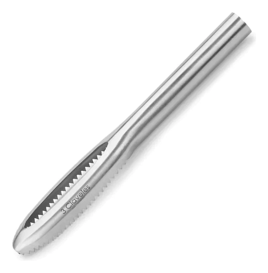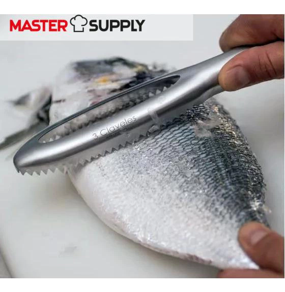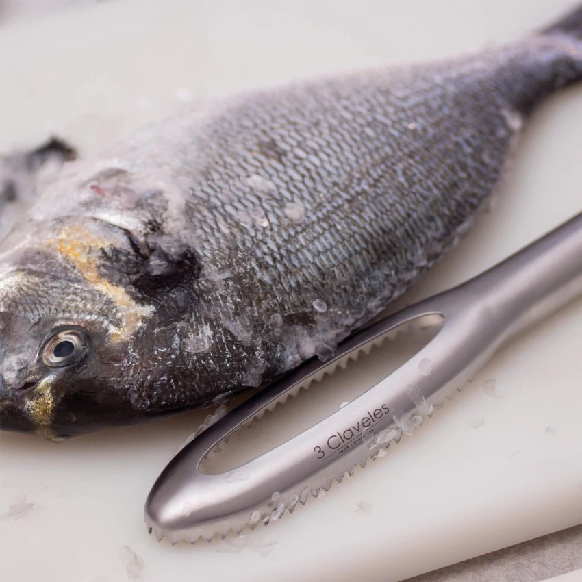 Descamador Quita Escamas Pescado Acero Inoxidable 3 Claveles Beneficios: - Alto rendimiento, permite limpiar pescado de cualquier tamaño en unos segundos. - Rapidez y facilidad para limpiar el pescado sin atascarse gracias a las dos filas con bordes dentados en acero inoxidable que ofrecen 28 puntos de contacto con el pescado, la punta en sierra para las escamas más pequeñas, y 2 bordes dentados para una mejor cobertura. - Cómodo y Seguro, la forma del mango, para el empleo con o sin guantes, ayuda a agarrarlo desde diferentes ángulos. - El acabado ofrece un agarre fácil y firme y evita que resbale de la mano. - El peso ligero y equilibrado, reduce al mínimo el esfuerzo y la fatiga de la muñeca, previniendo lesiones por uso repetido. - Higiénico, la estructura abierta del quita escamas facilita la limpieza y evita el riesgo de contaminación del pescado no permitiendo la acumulación de residuos que pueden generar bacterias. Se limpia fácilmente usando agua y jabón o en el lavavajillas.