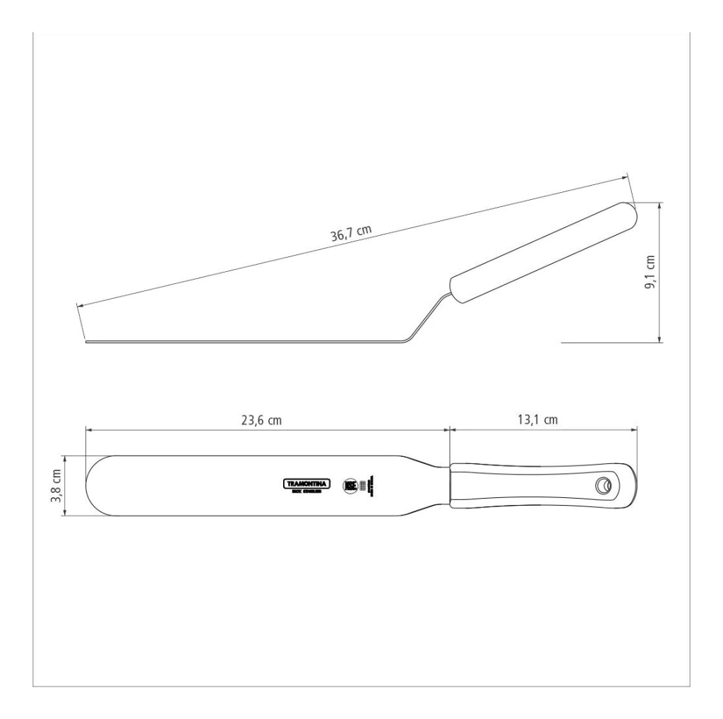 Espátula Repostera Acero Inox Profesional Tramontina 25cm características: - Es ideal para acabados y para retirar el exceso de coberturas en las tortas. - Lámina resistente y duradera. - Lámina en acero inoxidable especial tratada térmicamente, lo que garantiza niveles de dureza media de 48 HRc. - Mango anatómico, higiénico y seguro. - Mango de polipropileno texturizado, lo que ofrece más comodidad y seguridad a la hora de manipularlo. DIMENSIONES - Largo: 43,5 cm - Largo de la lamina: 26,60 cm - Largo del mango: 13,1cm - Altura: 3,7cm