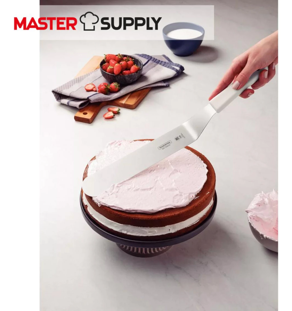 Espátula Repostera Acero Inox Profesional Tramontina 30cm caracteristicas: - Es ideal para acabados y para retirar el exceso de coberturas en las tortas. - Lámina resistente y duradera. - Lámina en acero inoxidable especial tratada térmicamente, lo que garantiza niveles de dureza media de 48 HRc. - Mango anatómico, higiénico y seguro. - Mango de polipropileno texturizado, lo que ofrece más comodidad y seguridad a la hora de manipularlo. DIMENSIONES: - Largo: 41,2 cm - Largo de la lamina: 28,1cm - Largo del mango: 13,1cm - Altura: 4,4cm