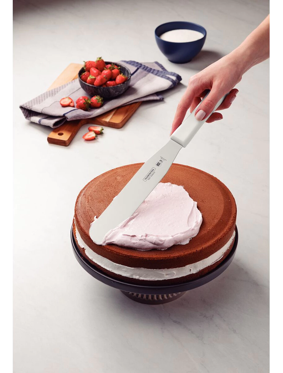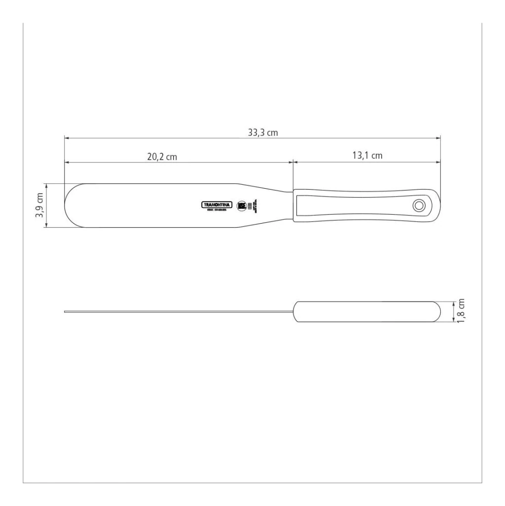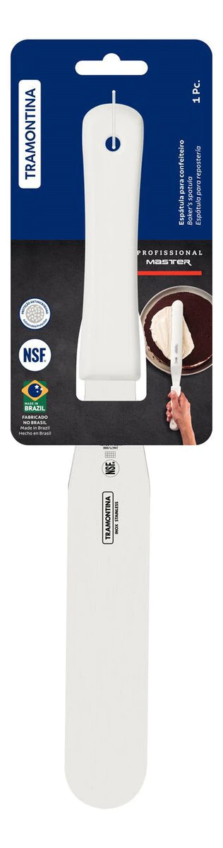 Espátula Repostería Acero Inox. Tramontina Profesional 20cm 1. Lámina fabricada con acero de altísima calidad, con tratamiento sub-zero. 2. Mango de polipropileno con protección antimicrobiana que inhibe el crecimiento de bacterias y hongos. 3. Mango con agujero pasante para colgar el producto. 4. Se pueden lavar en lavavajillas. Características: Hoja de acero inoxidable 8''. Mango de polipropileno inyectado directamente sobre la espiga de la hoja. Largo de hoja: 20cm Ancho de hoja: 3,7cm Largo total: 33cm Código: 24671/188
