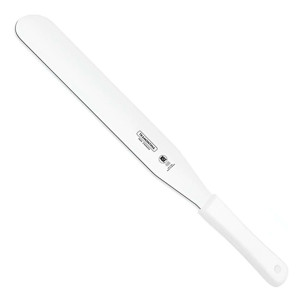 Espátula Repostería Acero Inox. Tramontina Profesional 30cm Calidad y durabilidad para profesionales que trabajan duro. Con tecnología de punta, los cuchillos profesionales siempre están preparados para actuar y embellecer con cualquier ingrediente. No falta la eficiencia. La altísima calidad de las palas, como resultado del tratamiento térmico consistente en revenido (calentamiento de la pala), bajo cero (enfriamiento de 50 a 196 grados bajo cero) y revenido (aumento de la elasticidad del acero) garantiza una vida larga y eficiente. La anatomía y ergonomía del mango de polipropileno texturizado, inyectado directamente en la espiga de la hoja, ofrecen seguridad y comodidad durante el manejo. La protección antimicrobiana inhibe y reduce el crecimiento de bacterias y hongos. Esta tecnología se incorpora durante el proceso de fabricación de los cables y tiene una duración de toda la vida del producto, pero no elimina la necesidad de lavarlos. Largo total de 43,5cm, la espátula mide 30,4cm.