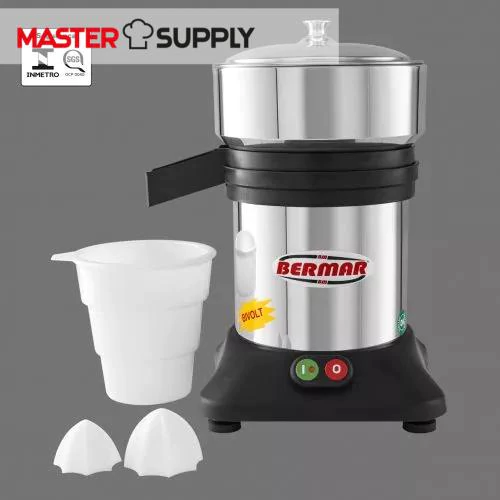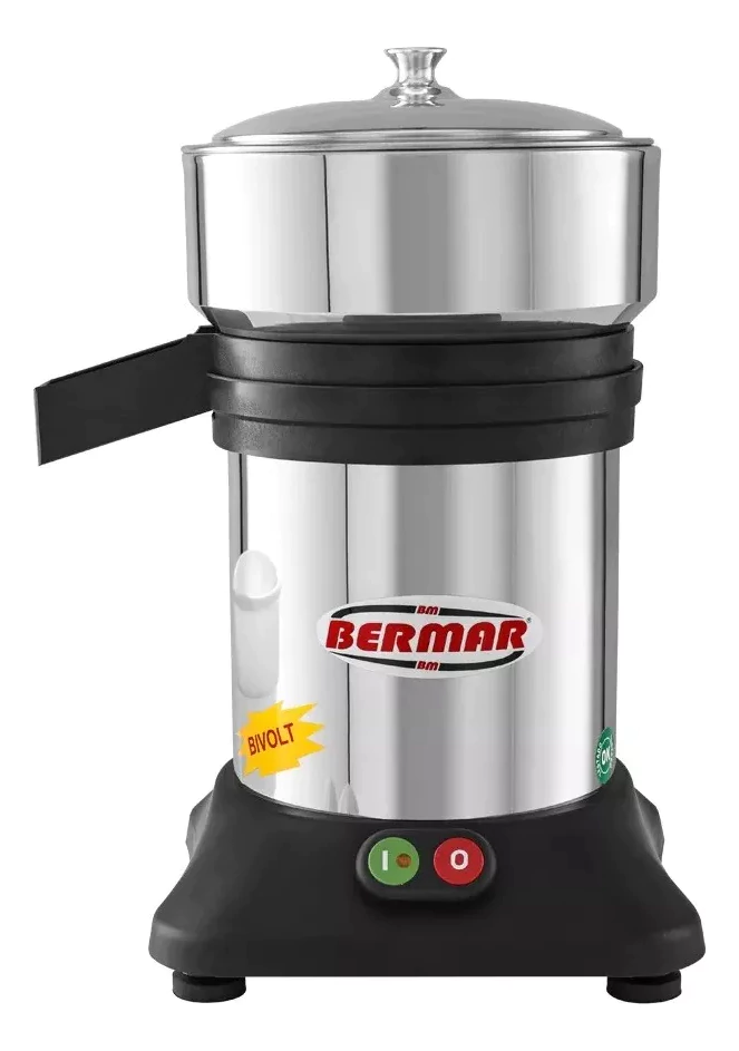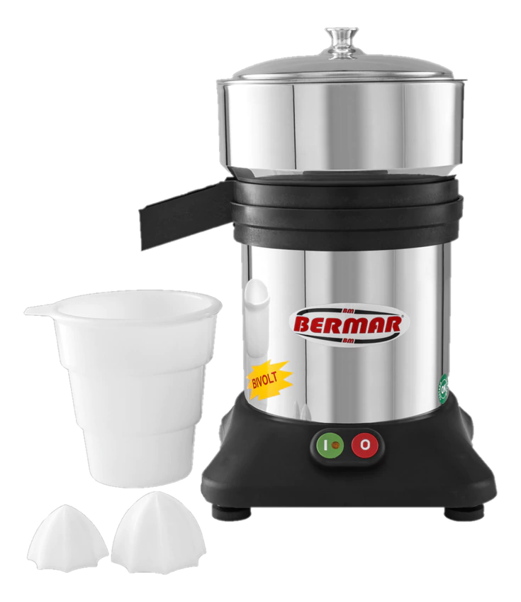 Exprimidor Industrial Super Bermar Bm-79 Características Técnicas: o Motor 1/2 HP 530 W - 50Hz voltaje: 220V (con selector) o consumo: 0,41 kw/h monofásico rpm: 1720 o cuerpo y cámara de acero inoxidable, tapa de aluminio embutido y pulido Dimensiones de la máquina: o longitud: 270 mm altura: 415 mm o ancho: 275 mm o peso neto: 6,5 kg Dimensiones del embalaje: o profundidad: 300 mm altura: 420 mm o ancho: 260 mm peso bruto: 7 kg cubo: 0,03 m3 Utilidad: extraer jugo de frutas cítricas.