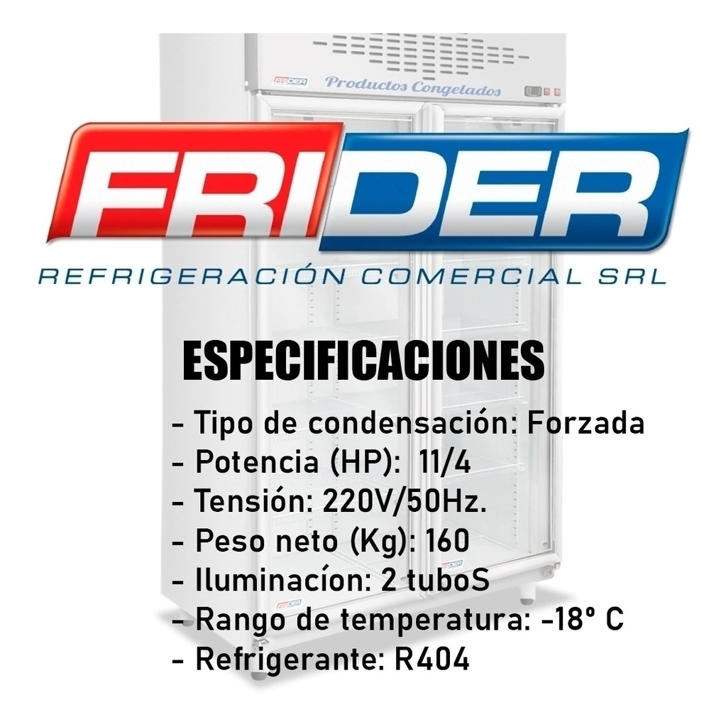 FREEZER EXHIBIDOR BT 2 PUERTAs Modelo: BT2 Detalles: - Gabinete en chapa electrozincada prepintada blanca con protección vinílica. - Aislación en poliuretano expandido de 40 Kg/m3 libre de CFC. - Evaporador de techo con forzador de aire y descongelamiento automático. - Puerta con marco de aluminio blanco, manija incorporada y termopanel triple vidriado calefaccionado. - Burlete magnético y sistema de cierre con resorte de tensión. - Excelente iluminación lateral. - Cenefa superior iluminada. - Parrillas interiores regulables, plastificadas color blanco. - Control de temperatura automático digital. - Patas plásticas regulables para nivelación. - Equipo de frío en la parte superior. - Modelo: 2 puerta - Largo (mm): 1310 - Profundidad (mm): 650 - Alto (mm): 2000 - Capacidad (Lts): 940 - Tipo de condensación: Forzada - Potencia (HP): 11/5 - Tensión: 220V/50Hz. - Peso neto (Kg): 160 - Iluminación: 2 tubos - Rango de temperatura: -18º C - Refrigerante: R404