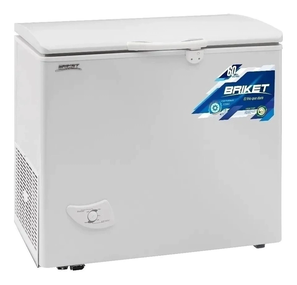 Freezer Horizontal Briket FR2500 Capacidad: 224 Litros En este freezer Briket podés guardar grandes cantidades de alimentos, por largos períodos de tiempo en condiciones óptimas sin preocuparte por desperdiciar comida. Eficiencia y ahorroGracias a la eficiencia energética B vas a aprovechar al máximo su rendimiento ya que ahorra un 35% de consumo. Exterior en chapa de acero prepintada blanca Interior en chapa galvanizada Aislación en poliuretano expandido de 40kg/m3 Mesada en ABS termoformado Tapa con burletes de PVC de cierre total, atoxico, no migratorio y antihongos Bisagras balanceadas Canasto interior plástico Clase energética B Ancho 945 mm Profundidad 700 mm Alto 840 mm Peso: 50,1 Kg