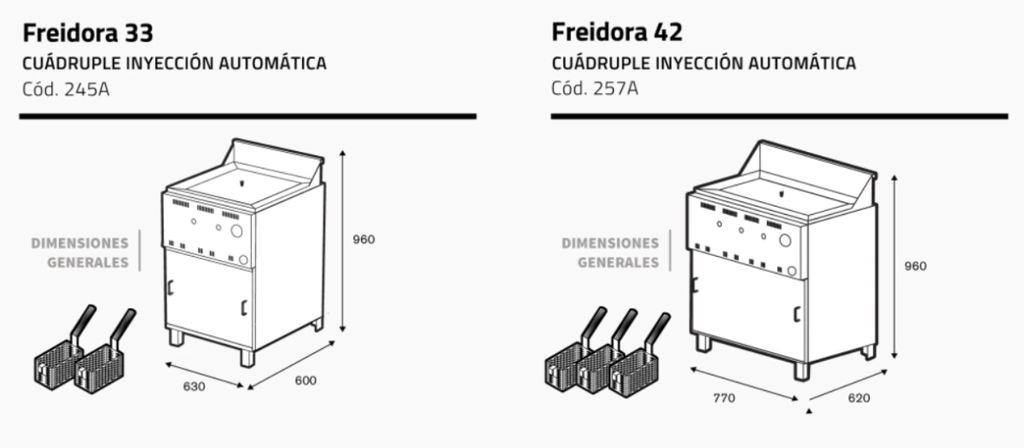 Freidora 42 litros / Cudruple inyección y sistema de alta recuperación COD 257A Gabinete 100% acero inoxidable esmerilado. Puerta inferior desmontable. Tacho Acero Inoxidable con tapa de acero inoxidable. 3 Canastos acero inoxidable de 24x18x12 cm. 18 inyectores + piloto Incluye Control Automatico (mini Zip) Incluye válvula de seguridad. Desagote con llave esférica de bronce. Incluye llave de paso de gas interior. Medidas: 77x62x96 cm Calorías: 26.200 Ventajas: El control automatico de temperatura envita el riesgo de sobrecalientamiento del aceite, permitiendo a el operado puede trabajar en forma despreocupada.