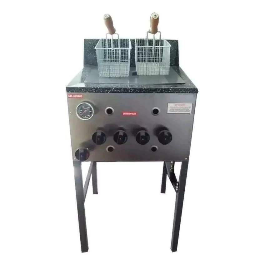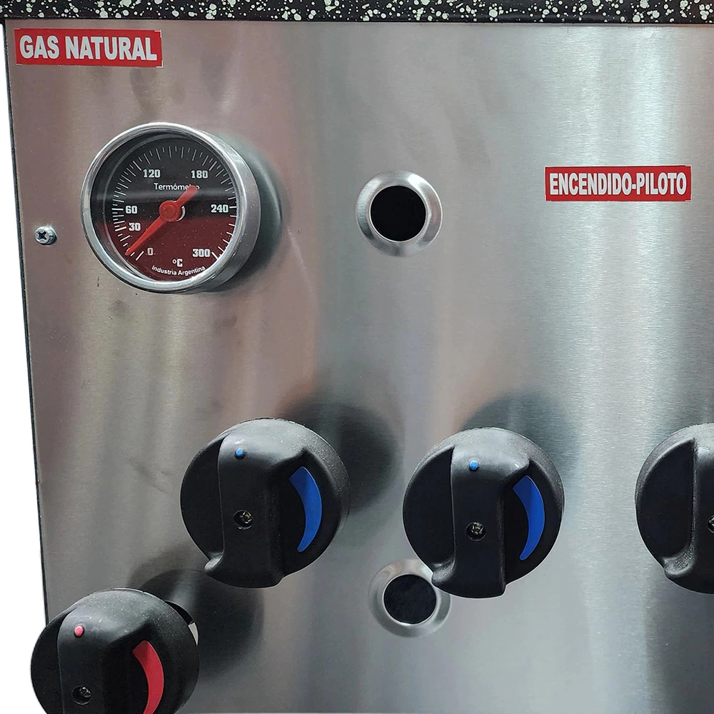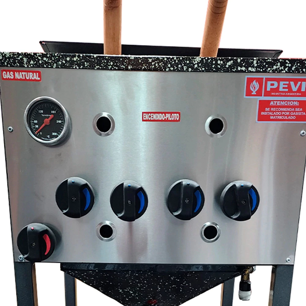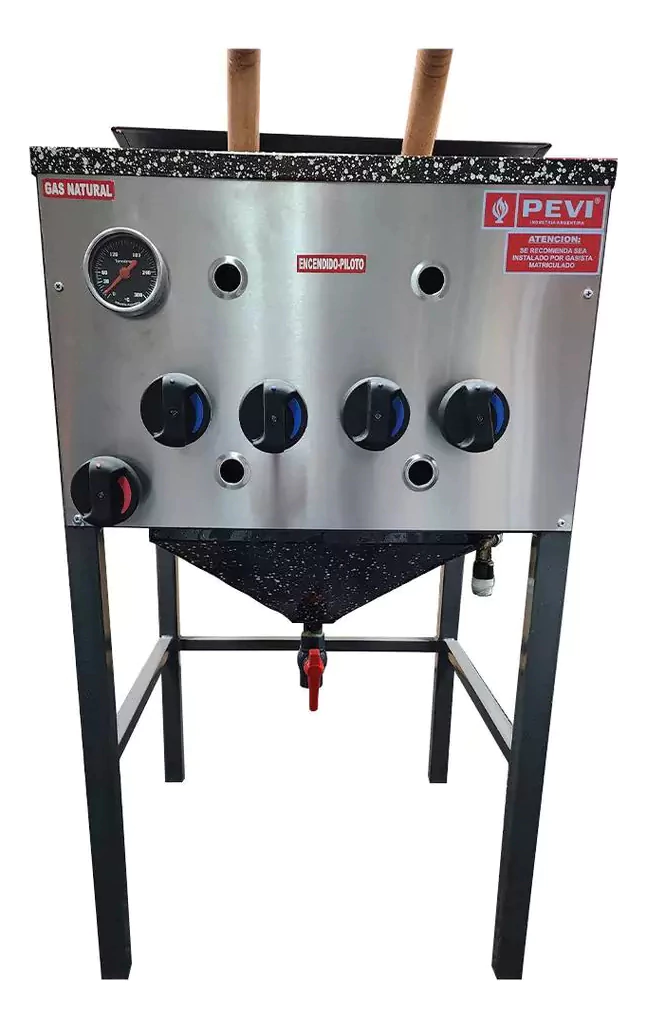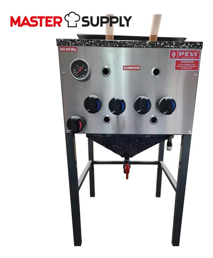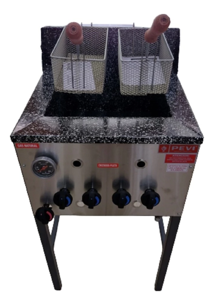 Freidora Industrial Pevi Con Valvula 38L Gas Envasado CARACTERÍSTICAS - Freidora con capacidad 38Lts. - Incluye dos canastos de alambre. - Bacha en chapa enlozada. - Exterior de acero inoxidable. - Laterales en chapa pintada epoxi. - Tapa superior en chapa pintada epoxi. - Termómetro analógico en el frente. - Robinetes industriales de bronce. - Perillas de baquelita térmica. - Piloto y tubo lanza llama de comando individual. - Llama piloto permanente y sectores de quemadores tipo inyección. - Tipo de Gas, Envasado. - Con válvula de seguridad. DATOS TÉCNICOS: - Entrada de gas convencional de 1/2 pulgada - Potencia calorías/hora horno: 20000 - MEDIDAS EXTERNAS: ANCHO: 49cm. - ALTURA: 83cm. - PROFUNDIDAD: 54cm. - MEDIDAS CANASTO: ANCHO: 16cm. - ALTURA: 12cm. - PROFUNDIDAD: 30cm.