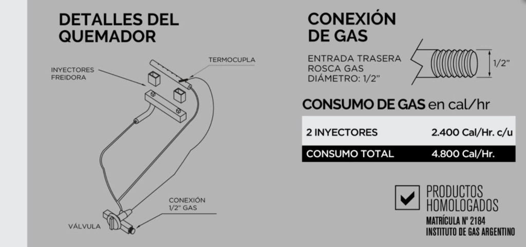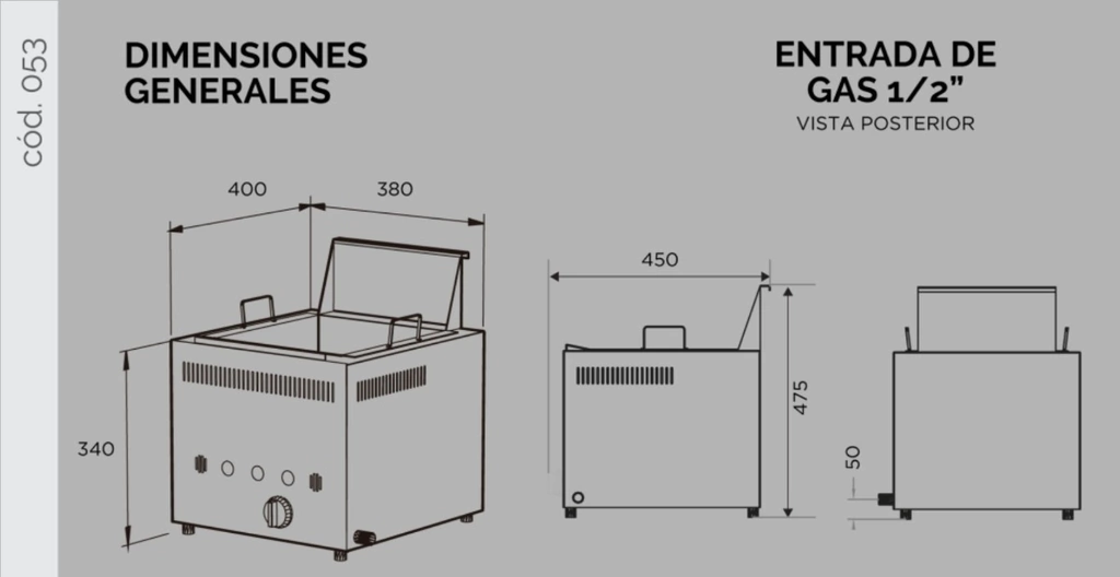 FREIDORA INDUSTRIAL SOL REAL 7L Modelo: 053 Con esta freidora Sol Real tendrás el complemento perfecto para tu negocio gastronómico. Podrás preparar platos en gran volumen para atender a todos tus comensales con rapidez. Así, garantizarás la salida ágil de cada pedido y brindarás el mejor servicio a tus clientes. Detalles: - Canasto con mango aislante de plástico - Gabinete 100% acero inoxidable esmerilado. - Tacho y tapa de acero inoxidable. - 1 Canasto de acero inoxidable. Medidas: 24x24x12 cm - Sistema de 3 inyectores verticales directos - 1 Comando + Piloto. - 1 robinete. - Aceite 7 litros. - Incluye válvula de seguridad. - Kilocalorías/h: 4.800 MEDIDAS: ANCHO: 38cm ALTO: 48cm PROFUNDO: 45cm