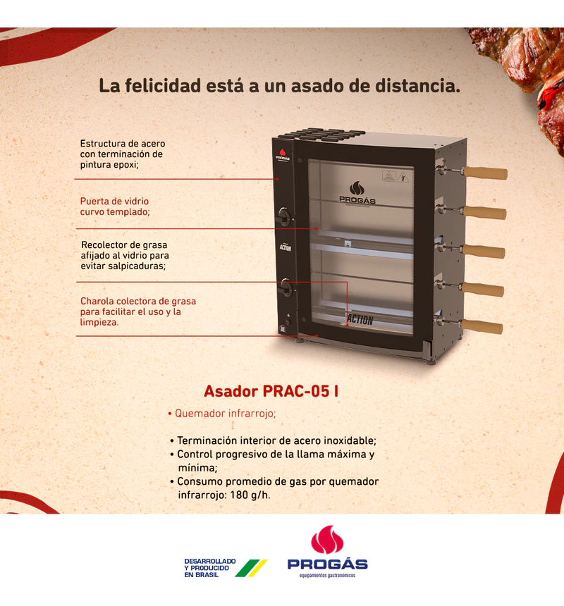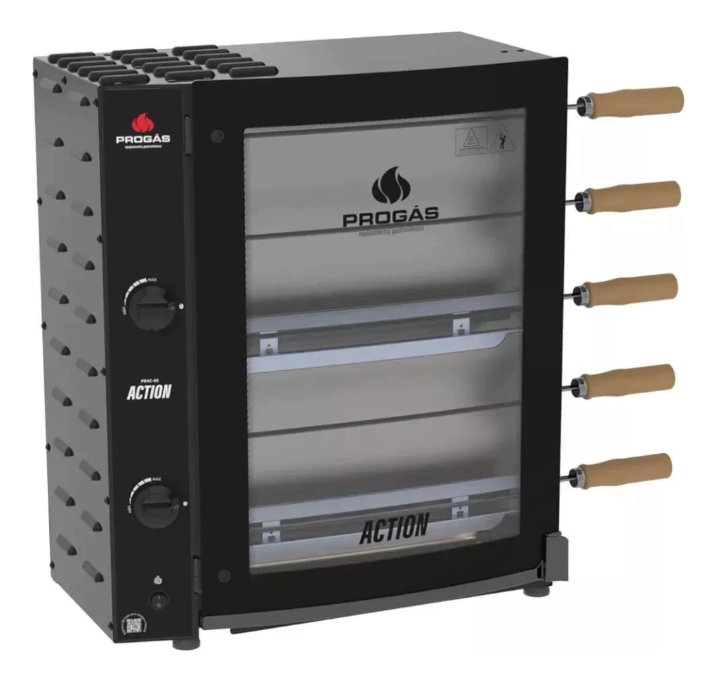 Asador Spiedo Mini PROGAS 5 espadas PRAC-05T Caracteristicas: - Voltaje: Bivolt (energía eléctrica utilizada únicamente para girar las brochetas) - Potencia: 30W - Consumo Eléctrico: 0,03 kWh - Consumo de gas: 2147 kcal/h - Gas de Fabrica: GAS ENVASADO GLP - Equipo multigas (Incluye picos para cambiar a gas natural) - Brochetas: viene con 5 brochetas simples - Capacidad: 1,3 kg (por brocheta) - Al ensartar carne, no superar los 100 mm de diámetro. - Capacidad de cocción: 3 brochetas de carne y 2 brochetas de corazón de pollo. - Capacidad aprox 6kg - Modelo PRAC-05 -Estructura de acero con acabado de pintura epoxi -Cajón recoge grasas para facilitar su manipulación y limpieza -Puerta de vidrio templado curvo -Recoge grasas fijado al cristal para evitar salpicaduras -Acabado interno en acero inoxidable -Calefacción por infrarrojos -Control progresivo de llama máxima y mínima -Consumo medio de gas por quemador de infrarrojos: 2147 kcal/h Dimensiones: - Embalaje: 69 cm alto x 78 cm ancho x 40 cm profundidad - Producto: 64,7 cm alto x 75 cm ancho x 33 cm profundidad - Brocheta (útil): 42 cm - Brocheta (total): 63 cm - Cajón colector: 29 cm ancho x 40 cm profundidad Peso neto: 16 kg Peso bruto: 19 kg