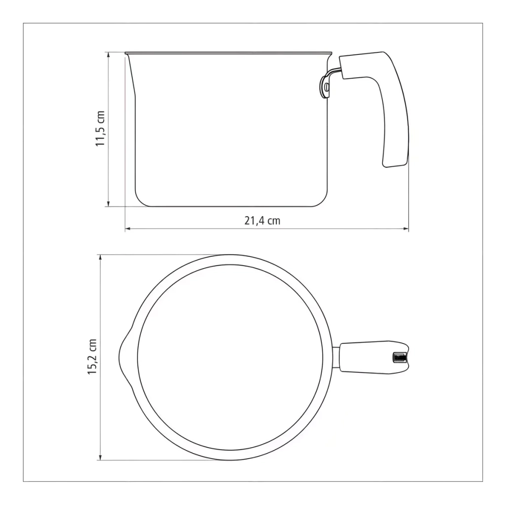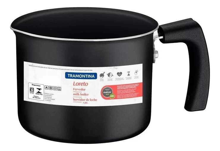 Jarro Hervidor De Leche Tramontina Teflon Loreto 14cm CARACTERÍSTICAS GENERALES: o Material: Teflón Antiadherente o Modelo: 23384/014 o Marca: Tramontina o Capacidad: 1,7 lts o Medidas: 11 cm de alto x 14 cm diámetro Características principales Marca Tramontina Modelo 20384/014 Color Negro Material Aluminio Capacidad en volumen 1,7 L Diámetro 14 cm Altura 11,40 cm Con revestimiento antiadherente Sí Con tapa No Es apto para lavavajillas Sí