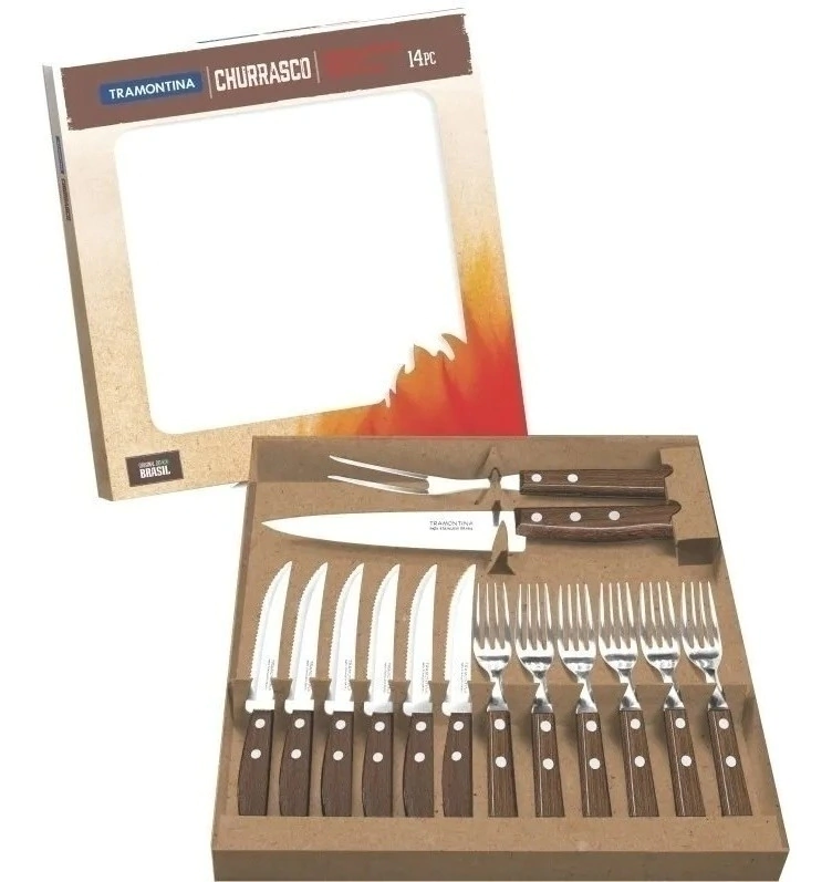 JUEGO DE CUBIERTOS TRAMONTINA 14 PIEZAS PARRILLA Características: o Presentación en caja. o Incluye: 6 Cuchillos 5" // 6 Tenedores de mesa // 1 Cuchilla de asado 7" // 1 Tenedor trinchante. o Laminas de acero inoxidable. o Mangos de madera. o Fabricado en Brasil.
