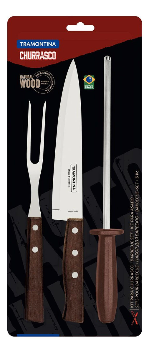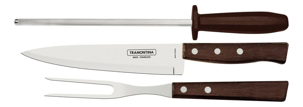 Juego Trinchante Asado 3pzs Acero Inox Madera Tramontina Características Técnicas: o Cuchillo Pescado 7": 30x1,4x3,8cm o Tenedor Trinchante: 25,2x2,3x2,3cm o Chaira 8": 31,5x3x4cm Características principales Marca Tramontina Modelo 22299/055 Cantidad de piezas 3 Materiales del mango Madera Material del cuerpo Acero inoxidable Incluye tabla No Incluye cuchillo Sí Incluye cepillo No Es apto para lavavajillas Sí Es un kit de fábrica Sí