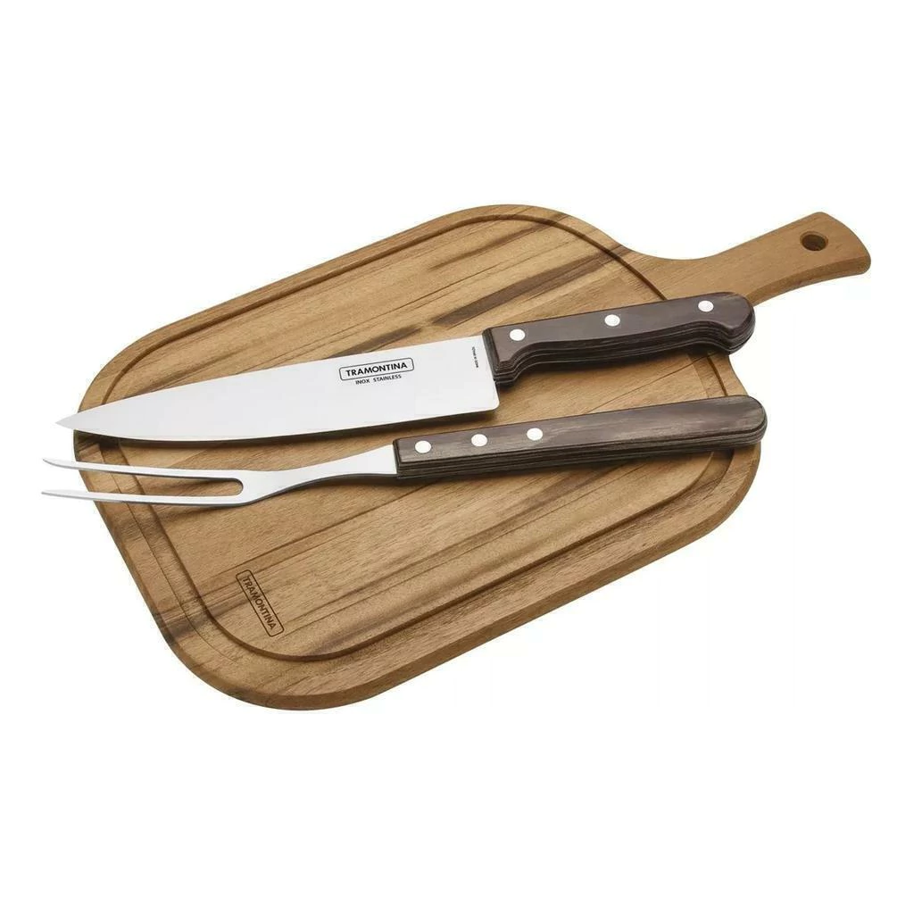 Kit Asado Tramontina 3pz Acero Inox Mango Tabla de Madera Beneficios del Producto: - El Juego para Asado Polywood Tramontina de Acero Inoxidable con Mango Rojo y Tabla de Madera de 3 piezas, va a proporcionarle más facilidad durante la preparación y el momento de servir cortes a sus invitados en sus días de confraternización. - El cuchillo y el trinchante se fabrican con láminas de acero inoxidable, altamente durable. Los mangos de madera tratada Polywood, que ofrecen belleza en cualquier ocasión, además de ser resistentes a impactos y, altas temperaturas. - Forma parte de este juego una bellísima tabla de madera para dejar los momentos todavía más especiales.