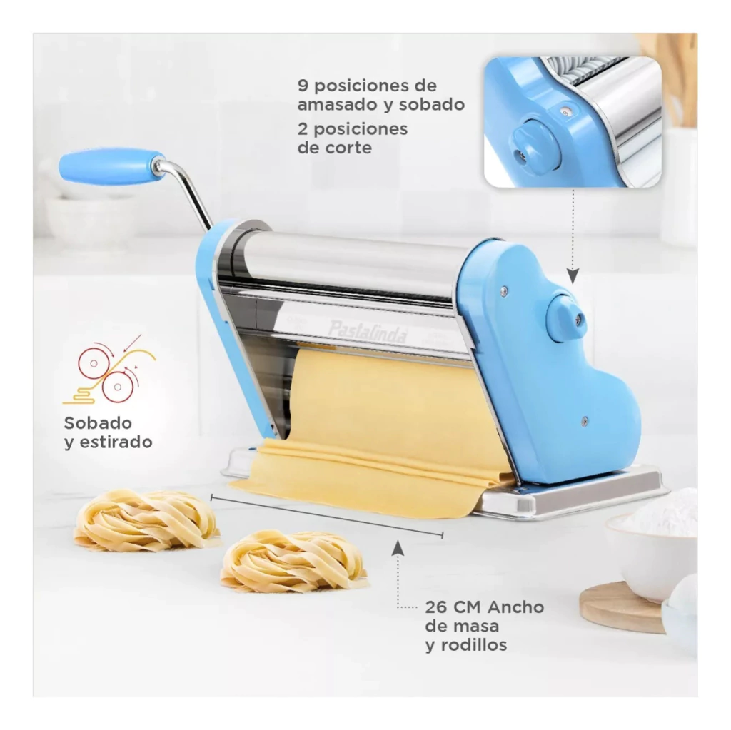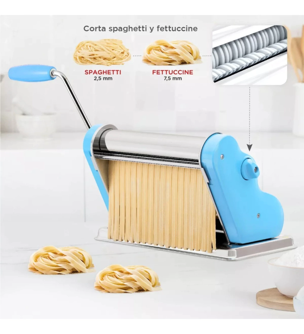 Amasa y estira todo tipo de pasta, desde deliciosos tallarines y espaguetis hasta hojas de masa para lasañas, canelones, ravioles, sorrentinos, cappelettis, pappardelle y una amplia variedad de pastas laminadas que puedas imaginar.