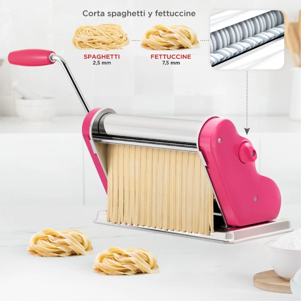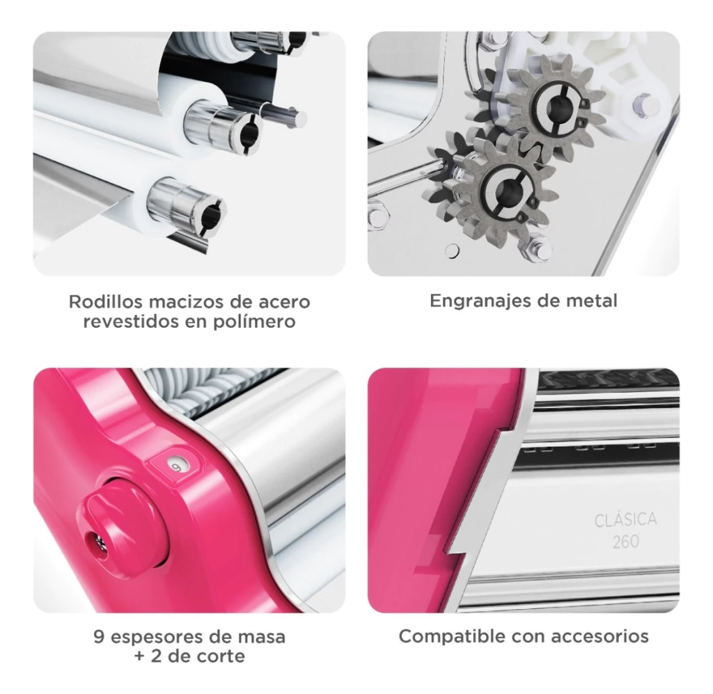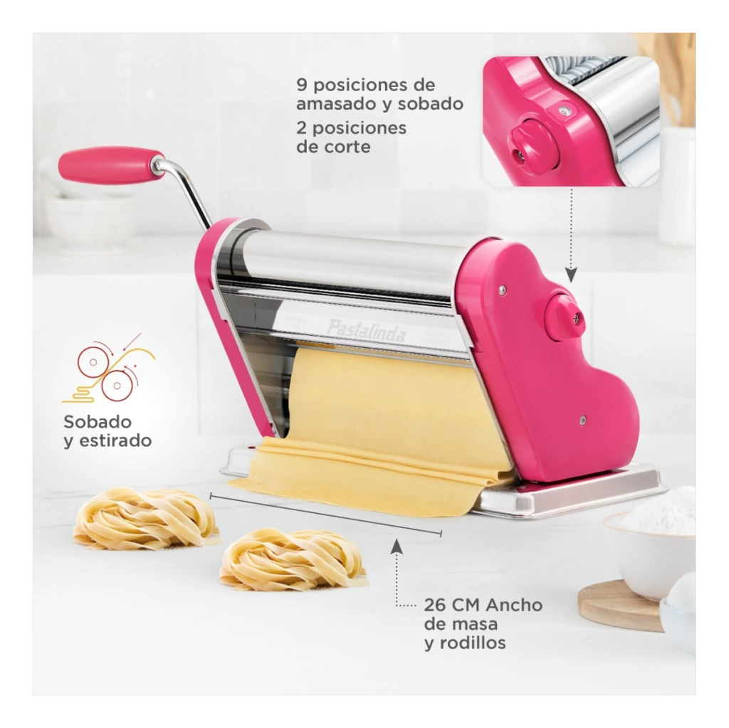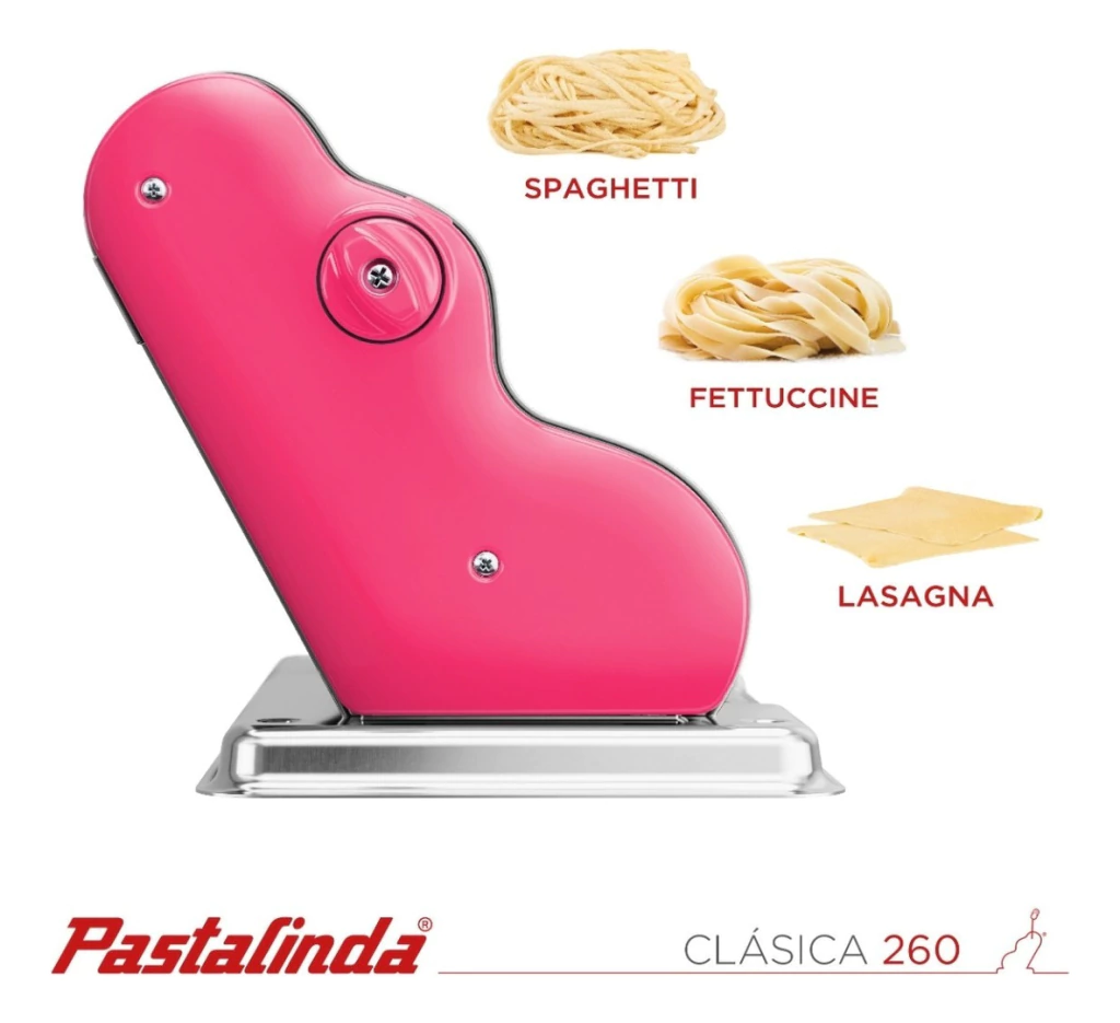 PASTALINDA ® CLÁSICA 260 | Tienda Oficial Máquina elaboradora de Pasta Casera, única en el mercado con 26 cm de ancho. Una máquina de mayor tamaño, que te permitirá preparar más cantidad de pasta en menor tiempo. La aliada de los emprendedores gastronómicos. - Amasa y estira todo tipo de pasta, desde deliciosos tallarines y espaguetis hasta hojas de masa para lasañas, canelones, ravioles, sorrentinos, cappelettis, pappardelle y una amplia variedad de pastas laminadas que puedas imaginar. ¡Disfrutá del verdadero sabor de pastas caseras hechas en casa! Características: o Nuevos engranajes de metal (estirado) o Ancho de rodillo/hoja de masa 26 cm o 9 posiciones para sobado, estirado y 2 posiciones de corte o Estructura de acero inoxidable o Manija reforzada sin estría o Base con apoyo antideslizante o Rodillos* de sobado y estirado de la masa o Rodillos* de corte para tallarines (2,5 mm) y cintas (7 mm) *Los rodillos son macizos de acero, recubiertos con polímero alimenticio, asegurando resistencia y durabilidad. Incluye: o 1 Manija o 2 grampas para sujeción (5 cm largo de apertura)
