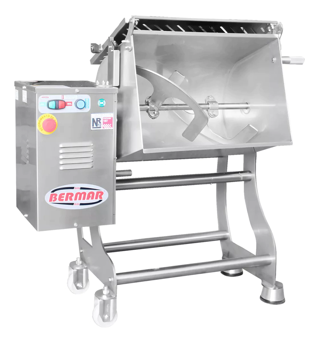 Mezcladora Carne Bermar 60 Lts BM-99 CARACTERÍSTICAS TÉCNICAS: Voltaje: 220V Motor: 1,25 CV - Monofásico Frecuencia: 50Hz Potencia: 1100W Consumo: 1,10 kw/h Capacidad de Producción: 60 Litros o 35 Kg Marca: Bermar Modelo: Bm99 Dispositivo de seguridad engranajes Nr12 en cárter de aceite Dimensiones de la máquina: o longitud: 880 mm altura: 940 mm o ancho: 450 mm o peso neto: 74 kg Dimensiones del embalaje: oprofundidad: 990 mm altura: 1040 mm oancho: 560 mm peso bruto: 91 kg Utilidad: mezclar carnes