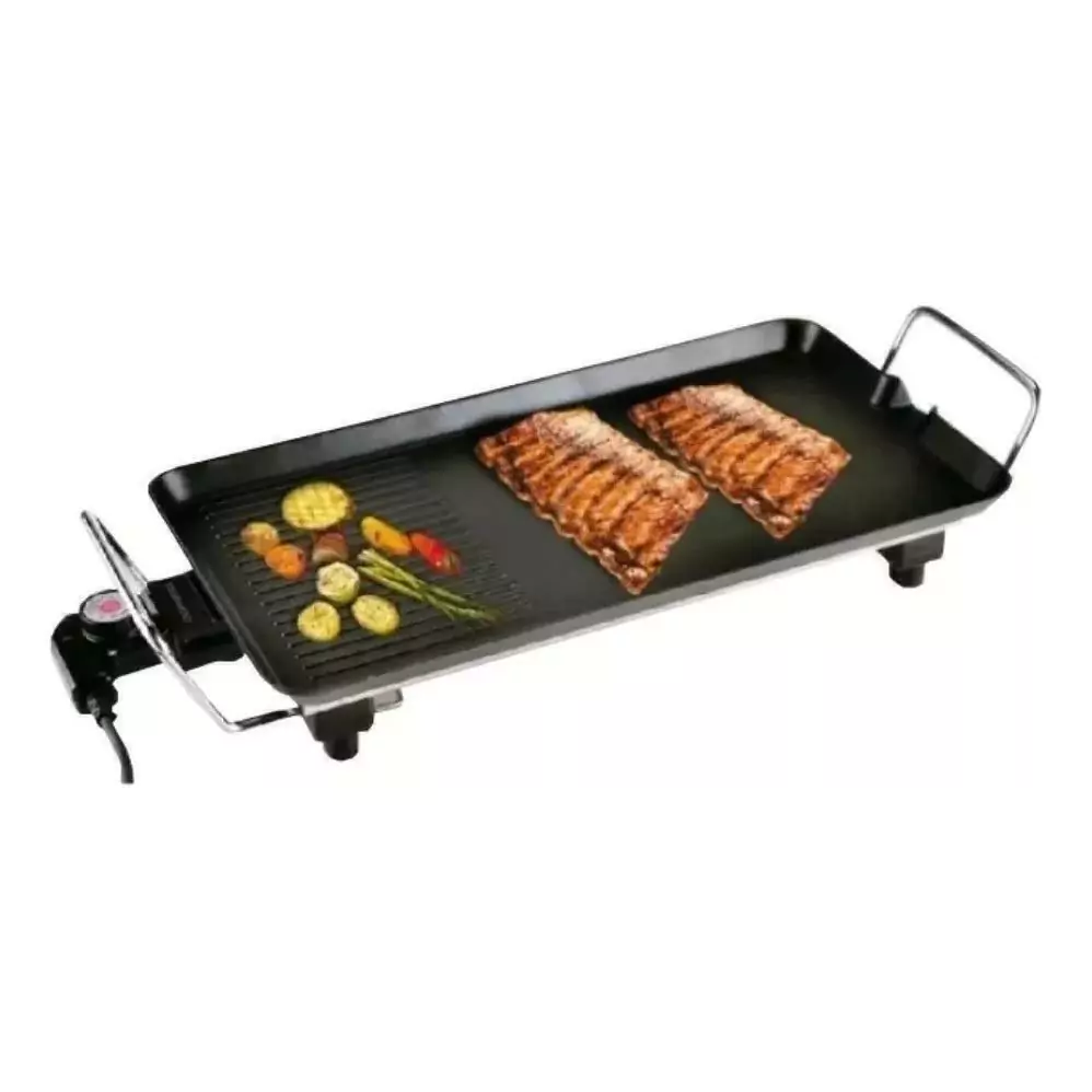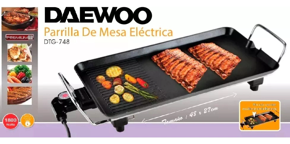 PARRILLA ELÉCTRICA ANTIADHERENTE DE MESA C/REGULADOR DAEWOO Descubrí un mundo de nuevos sabores sin necesidad de encender fuego, ni ensuciarte con carbón. Esta parrilla eléctrica es ideal para que disfrutes de deliciosas preparaciones asadas en cualquier lugar de forma práctica y sencilla. CARACTERÍSTICAS Voltaje: 220V - 240V Dimensiones: 48cm x 7cm x 27cm. Con medidor de temperatura. 5 niveles de temperatura. Potencia de 1800W. Ideal para patios y balcones. Fácil de limpiar. DTG748 Descubrí un mundo de nuevos sabores sin necesidad de encender fuego, ni ensuciarte con carbón. Esta parrilla eléctrica Daewoo DTG-748 es ideal para que disfrutes de deliciosas preparaciones asadas en cualquier lugar de forma práctica y sencilla. Fácil de limpiar: Su depósito de grasa te resultará muy útil para retirar y limpiar cada vez que termines de usar tu parrilla. En pocos minutos y sin esfuerzo quedará en perfectas condiciones para su próximo uso. Lográ el punto justo: Poné a prueba tus habilidades de cocina y experimentá con preparaciones originales para sorprender a tus invitados. Sus 5 niveles de temperatura te invitan a buscar nuevos puntos de cocción para que ningun plato sea igual al anterior.