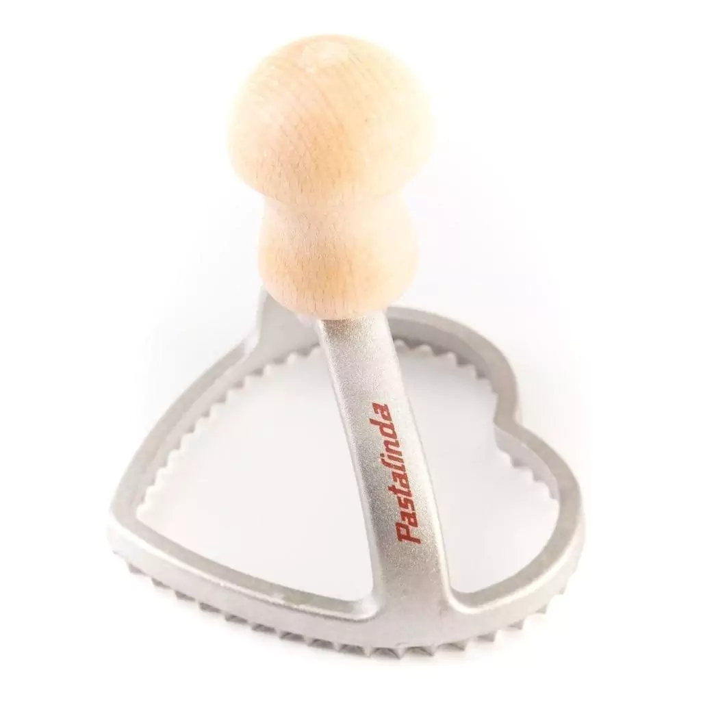 Características: - Marca, sella y corta ravioles - Raviol de 85X85 mm. - Tipo: Corazón - Mango de madera de haya - Construido en aluminio alimentario EN601 regulación europea