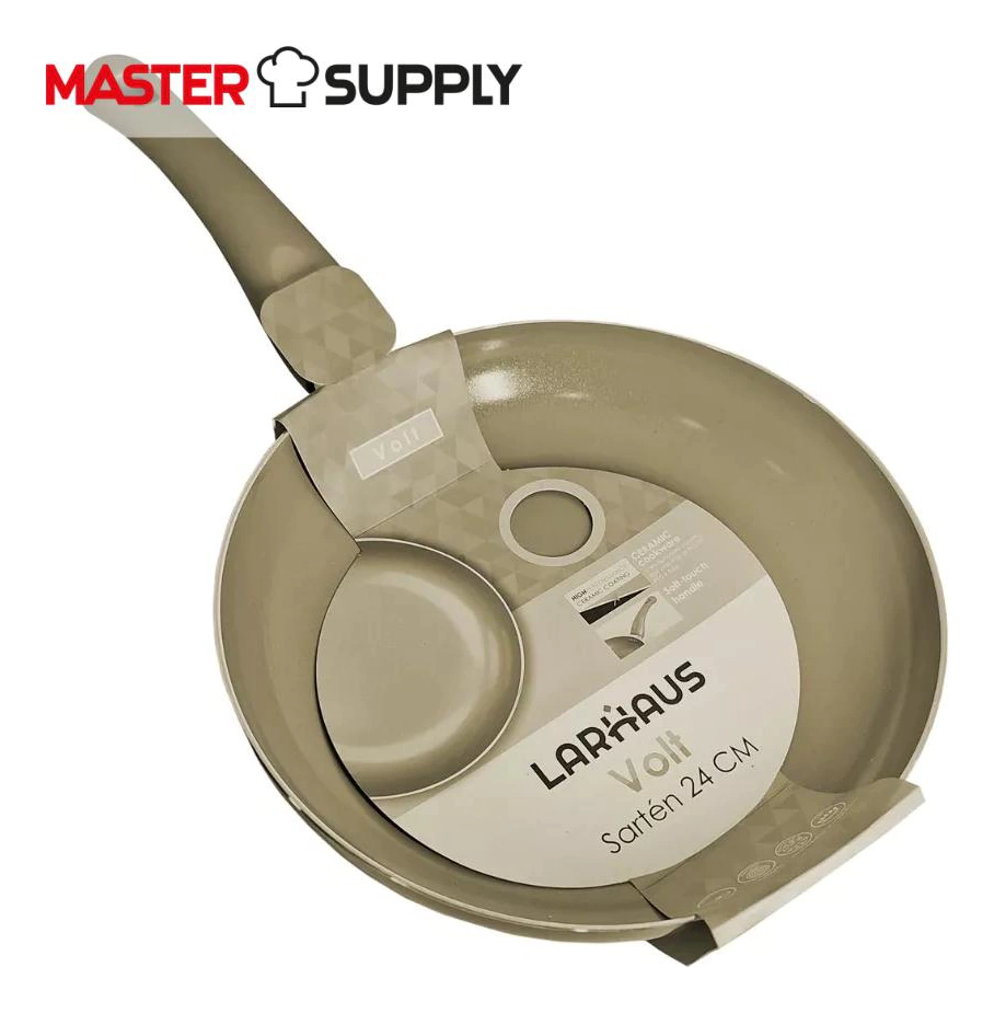 LARHAUS VOLT | SARTEN CHAMPAGNE 24 cm Primera calidad. CARACTERÍSTICAS o Marca: Larhaus o Modelo: Volt o Medida: 42,5 cm de largo TOTAL x 24 cm de diámetro x 4,5 cm de alto o Material: Cuerpo de 2.0 mm de espesor resistente a la corrosión, antiadherente cerámica de alta performance! Nueva pintura metálica y mango Soft Touch! o Color: Champagne o Apto para: Eléctrico, halógeno, vitrocerámica y cocina a gas! NO APTO PARA LAVAVAJILLAS