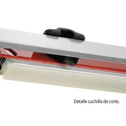 Selladora Bolsas Manual Corte Cizalla Lipari C400 40Cm Modelo CC400 Largo de sellado 40cm Ancho de sellado: 3mm Consumo: 770 Watts Espesor del Polietileno: 2 x 150 micrones Caracteristicas técnicas generales o Sellado por impulso. o Indicador luminoso de comienzo y fin de operación. o Regulación electrónica para sellado de diferentes espesores de bolsa. o Indicadas para sellar polietileno, polipropileno y similares, cuyo espesor no supere los 150 micrones. o Producción recomendada: 300-400 sellados por hora. Sellado o La bolsa se cierra en forma horizontal, realizándose el sellado de forma manual. o Tamaño de bolsa 40 cm. Sellado y Corte o Poseen en su manija una cuchilla de corte que se puede utilizar para fabricar bolsas a medida o para cortar el sobrante de la bolsa.