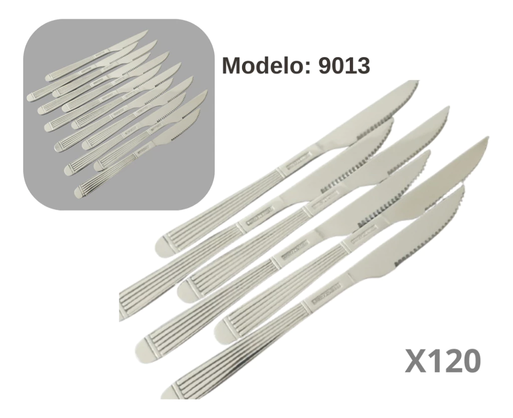 Set X120 Cuchillo Asado Carne Acero Inox. Mykonos Rayado Características: Marca: Ferinox Linea: Mykonos Rayado Modelo: 9013 Formato de Venta: Pack Pack: 120 unidades Tipo de Cuchillo: Asado Carne Apto para Lavavajillas: Si Material: Acero Inoxidable Largo Total: 22 cm